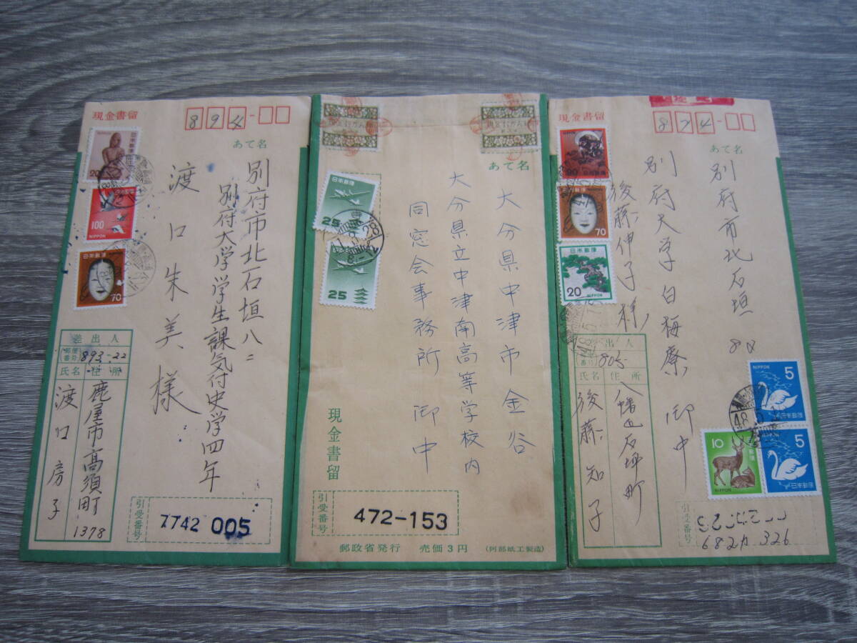 (消印有) 現金書留 普通切手 はにわの兵士200円切手 丹頂鶴100円切手 能面70円切手 円単位五重塔航空25円切手 風神90円切手 マツ20円切手