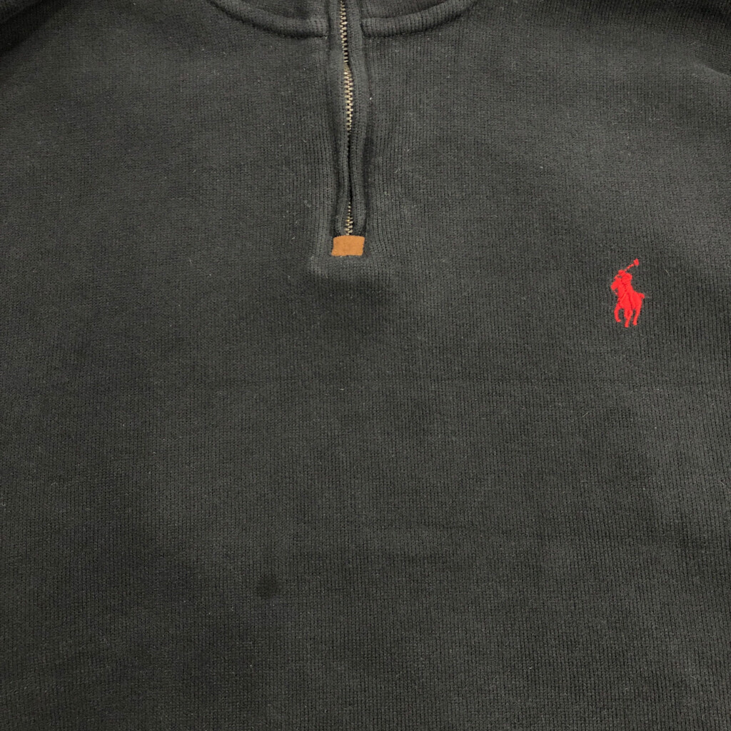 [商品管理番号] V1541 [ブランド] Polo by Ralph Lauren/ポロ ラルフローレン [サイズ] XL [実寸サイズ] 肩幅:約53cm 着丈:約71cm 身幅:約67cm 袖丈:約64cm [主な素材] 表地 : コットン [色] ブラック [仕様] ハーフジップ コットンセーター [状態] 汚れ:胸 特記事項:色褪せ | |||