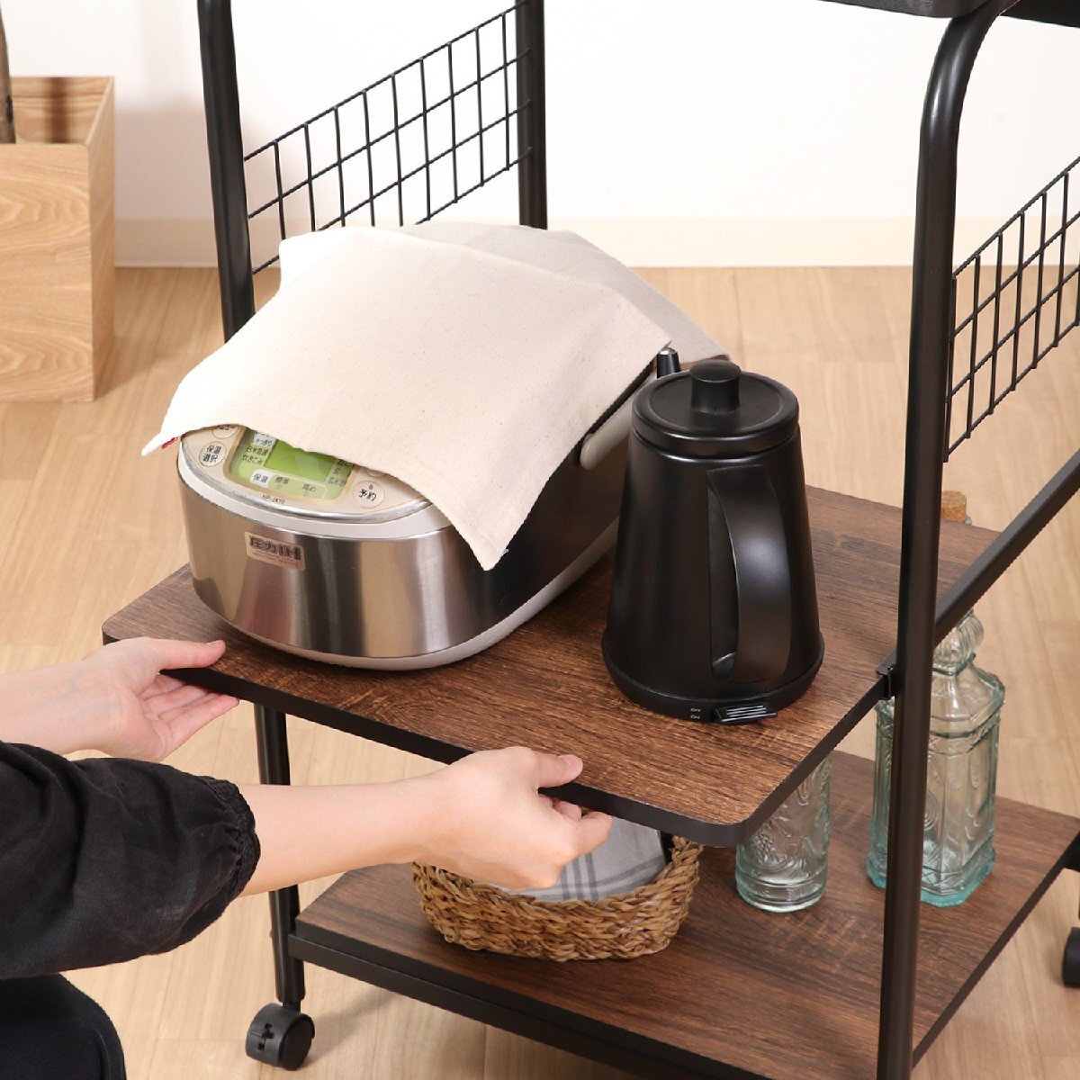 | サイズ | 全体:幅515 × 奥行410 × 高さ895mm 耐荷重(天板):15kg 耐荷重(スライドレール棚):5kg 耐荷重(下棚):10kg |
