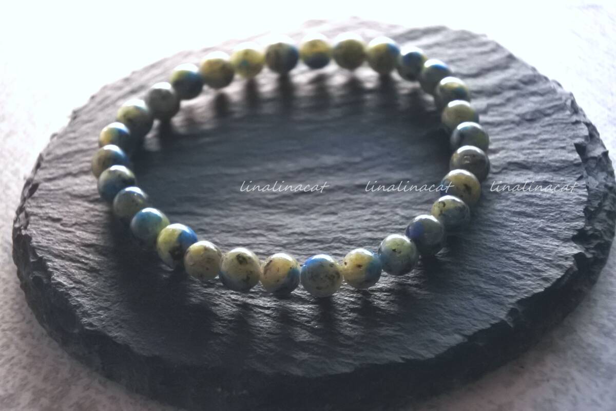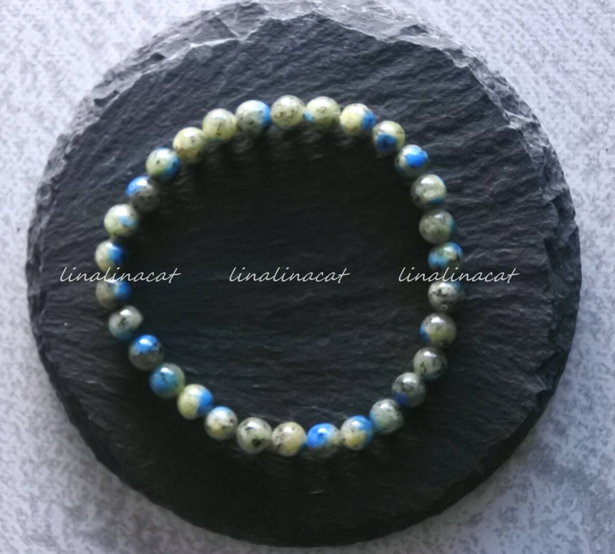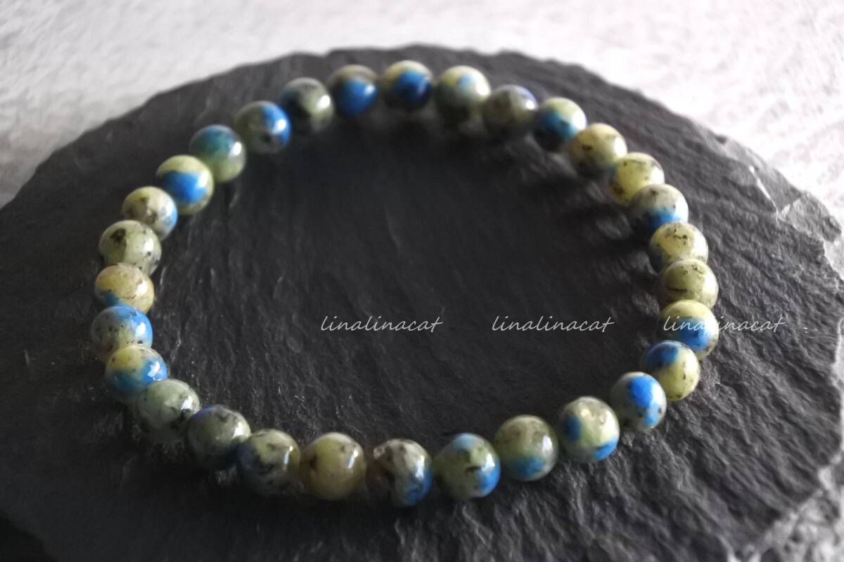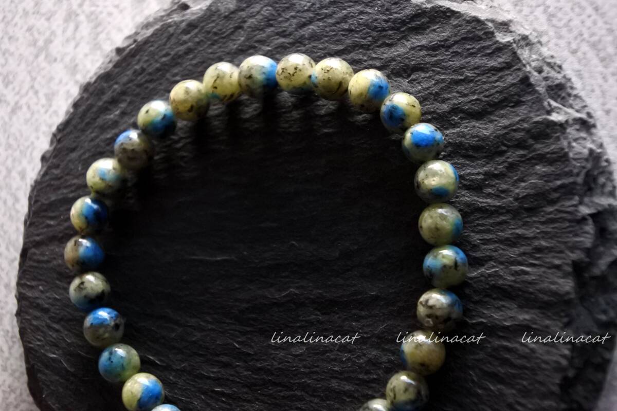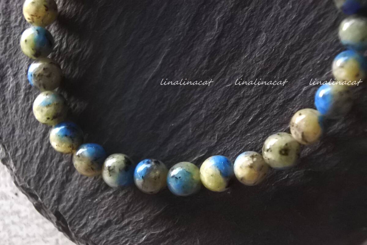 K2 ストーン ブレスレット 小ぶり 6㎜珠 16.5㎝ 険しいK2でしかとれないK2ストーン そのK2ブルーは「最強のヒーリングストーン」とも言われています。 一説にはそのパワーは「世界三大ヒーリングストーン」の「ラリマー」「チャロアイト」「スギライト」をも凌ぐほどだそうです。 艶やかな珠に淡いグリーン、そして美しいK2ブルーがくっきりと見える美しいお品です。 こぶりな6㎜珠で普段から身に着けやすく、時計との重ね付けにもお勧めです。 K2とは 、パキスタン・中国の国境付近のカラコルム山脈にある、エベレストに次ぐ世界第二の標高(8.611m)を誇る峻険な山です。 人里離れた立地や気象変化の激しさ等のため、登頂することが世界一難しい非情の山と呼ばれています。 このK2にしかない希少なストーンがK2ブルーです。 K2ブルーは「最強のヒーリングストーン」とも言われています。 一説にはそのパワーは「世界三大ヒーリングストーン」の「ラリマー」「チャロアイト」「スギライト」をも凌ぐほどだそうです。 さらに、K2ブルーは持ち主の霊的な力を呼び覚まし、精神を高次の次元へと繋げる強力なスピリチュアルパワーがあると言われています。 雄大な高峰のエネルギーを宿しているとされるK2ストーンですが、近年発見されたばかりということもあり、秘められたパワーはまだまだ未知数です。 ◇◇◇◇◇◇◇◇◇◇◇◇◇◇◇◇◇◇◇◇◇ ミネラルショーや天然石専門店などで購入したコレクションを多数出品中です。 試着したものもございますが基本的にアクセサリーは身に着けないため未使用のコレクションとなります。 天然石のためインクルージョンやクラック、欠けなどあるものもあるかと思いますが「気の良い子」ばかり集めていましたのでその子の個性と歴史として気に入ってくださった方にお譲りできれば幸いです。 日常のちょっとしたおしゃれに。 ささやかなお守りとして。 お気に入りを見つけられますように。 | ||