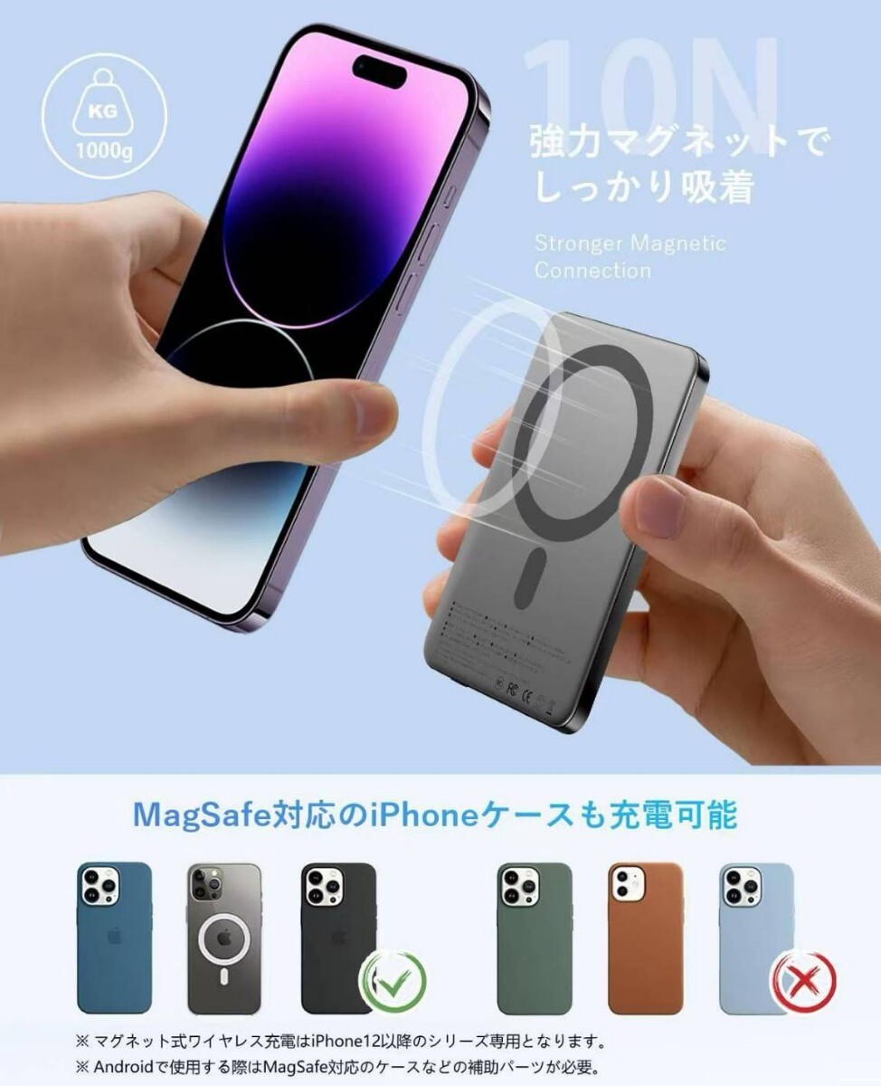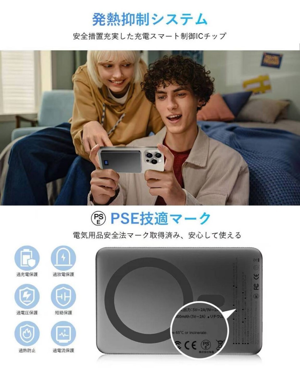 このモバイルバッテリー マグネットは内部に超強力の磁石を搭載しており、ワイヤレス充電器を使用した際の脱落を防ぎます。さらに、マグネット対応の保護ケースを装着した状態でも充電が可能です。過充電保護、過熱防止、漏電保護など各種保護機能を備え、PSE、FCC、RoHSなどの認証をクリアし、パワフルかつ安全な充電をご提供いたします。