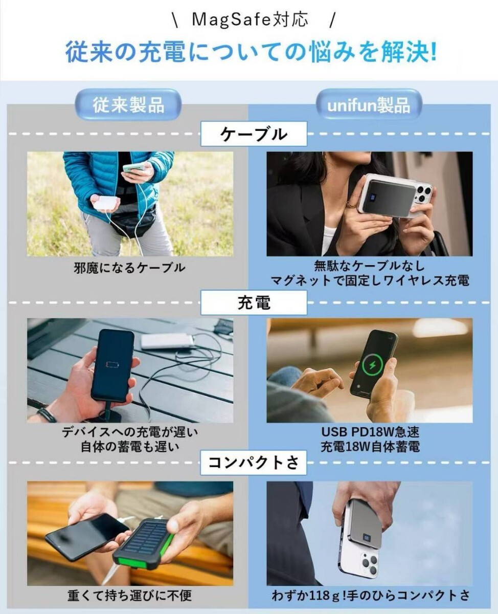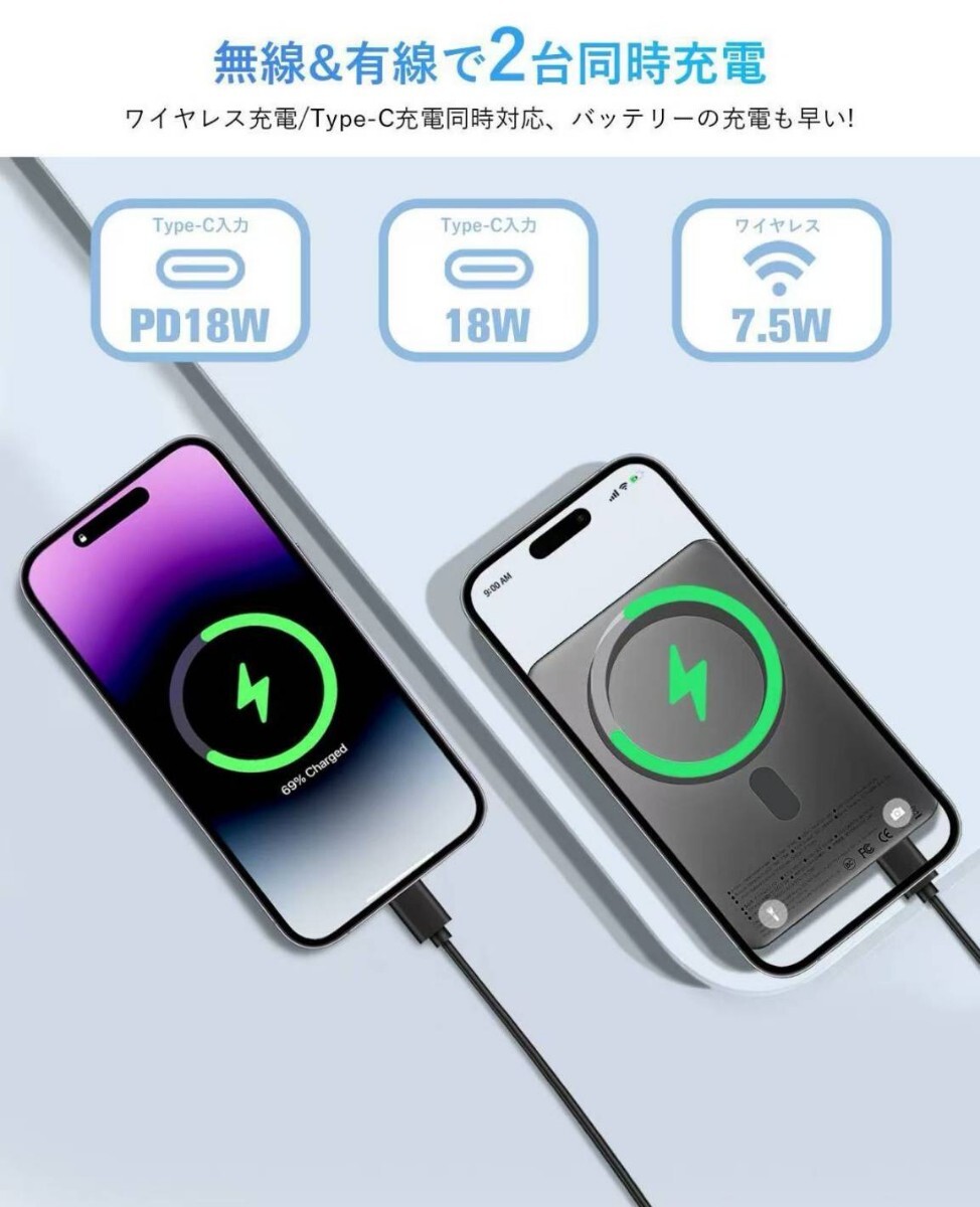 このモバイルバッテリー マグネットに搭載されたUSB-Cポートは、入力と出力の両方の機能を兼ね備え、2台のスマホを同時に充電する必要がある場合にも応対可能です。高端技術を採用し、スマホを高速に充電することができます。これは日常的に備蓄電源として使用に最適であり、一日中の安心を保証いたします。
