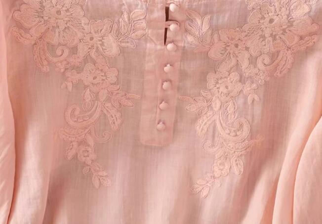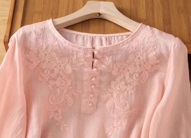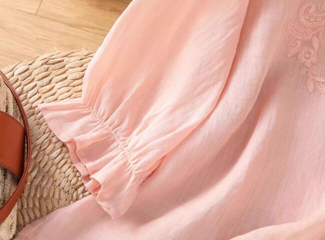 人気フリーサイズ チュニック トップス 麻100% 大人可愛 ナチュラル サラサラ 通気性肌触り抜群 ゆったり 刺柄 ピンク