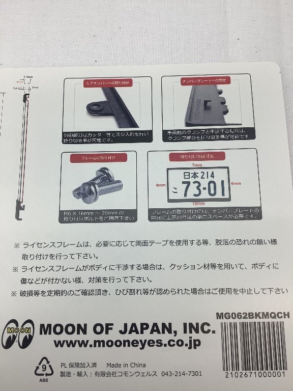 【203191】ムーンアイズのライセンスフレーム上下のデザインにクローム加工を施し、立体的になった MOON Equipped ライセンスフレームです。MOON Equipped ブランドらしい ブラックのライセンスフレームが雰囲気をグッと引き締めて、スタイリッシュに愛車のフロントフェイスを決めてくれます。USAでは装着していない車の方が少ないくらいポピュラーなライセンス フレーム。こだわった愛車に、普通のライセンスプレートじゃ物足りないという方にぴったりなドレスアップ アイテムです。封印部分をカットすればリアにも取り付け可能です。【サイズ】18.6cm x 33.7cm【材質】プラスチック【車検適合商品】令和3年10月1日 ナンバープレートの表示に係る新基準に、全面適用しているナンバープレート用のフレームです。