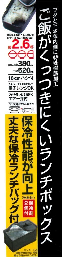 より ●ベーシックさに「かっこいい」をプラスしたModern+(モダンプラス)シリーズ ●お弁当箱下段に入るご飯の量、お茶碗(200ml)約2.6杯分 ●凸ラインにシボ加工と特殊樹脂でごはんがくっつきにくい ●入れ子式でコンパクト収納 ●エアー弁付き ●フタとシールブタをはずして電子レンジOK ●止め具ピン、箸ブタのツメを強くした強化構造 ●保冷バッグと保冷剤で鮮度も保てる