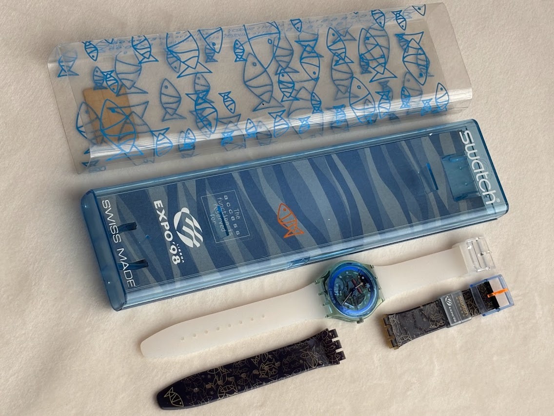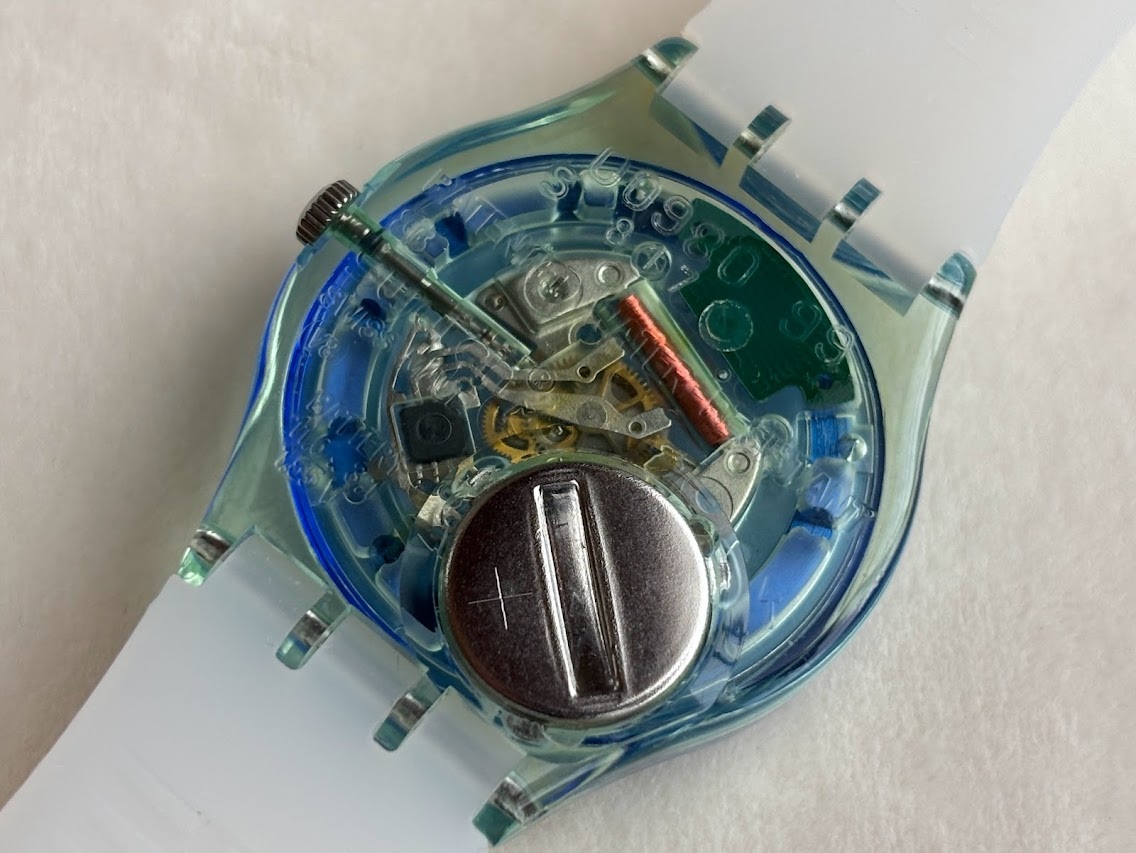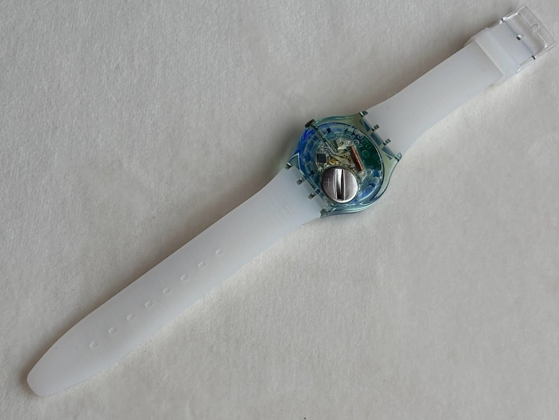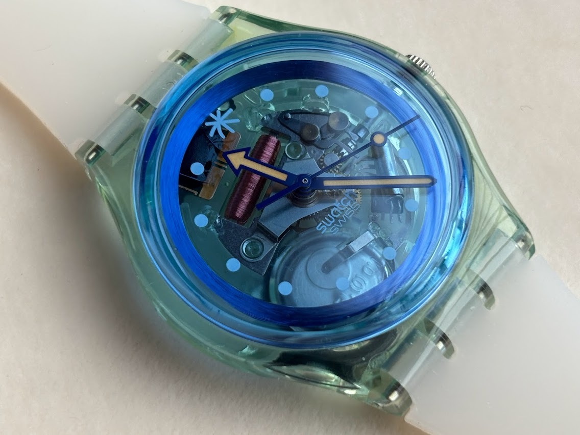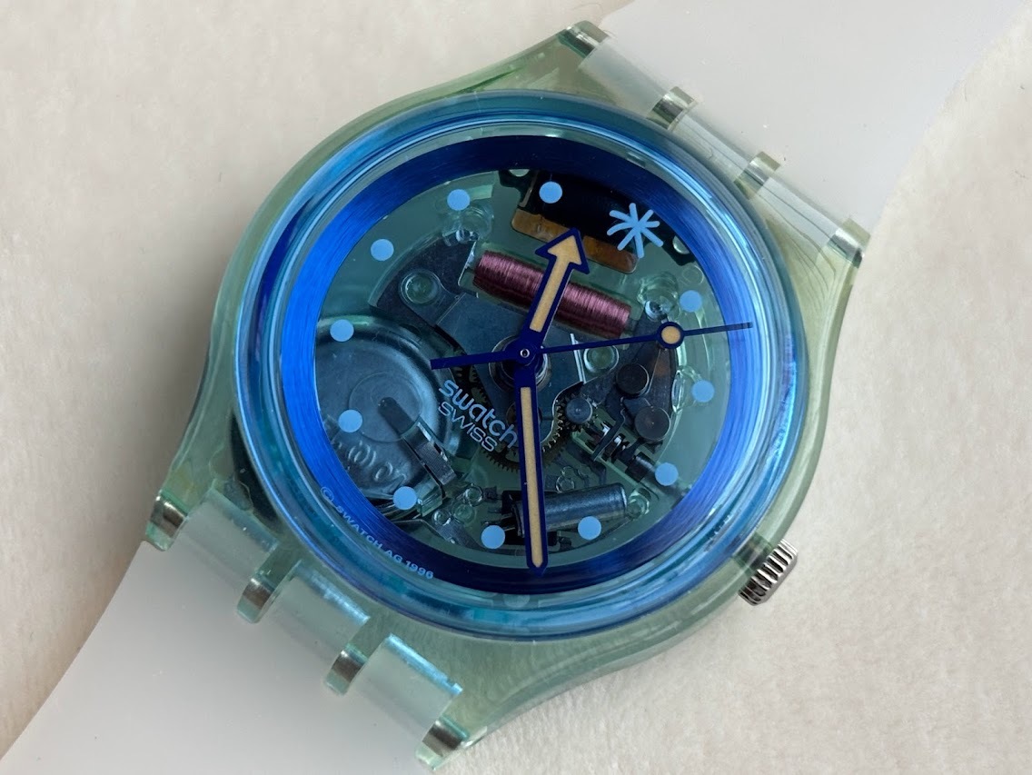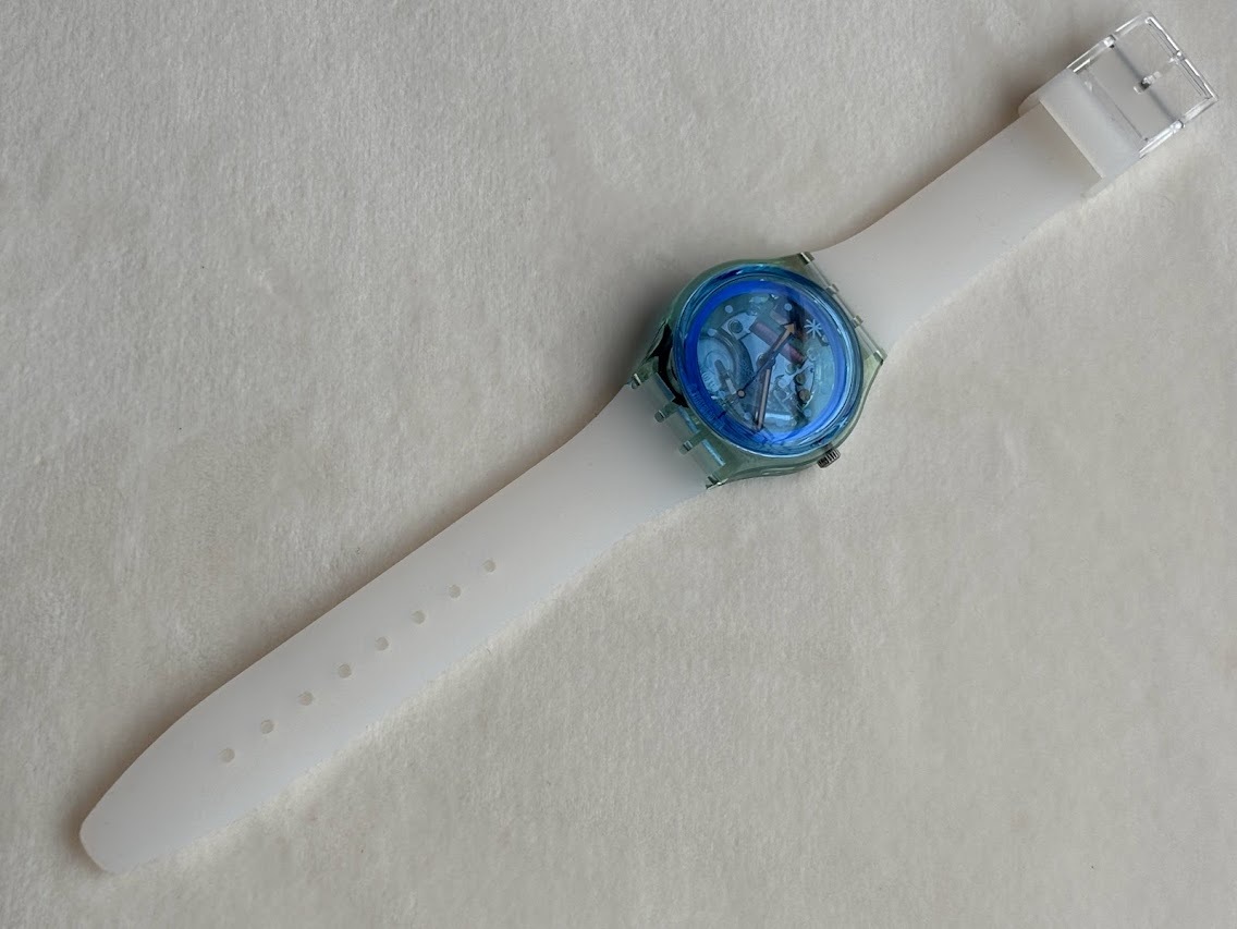 いまにも魚が登場しそうな、スケルトンブルー の SWATCH.