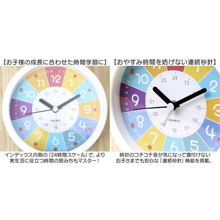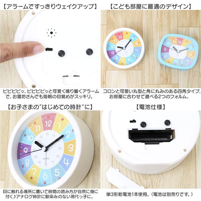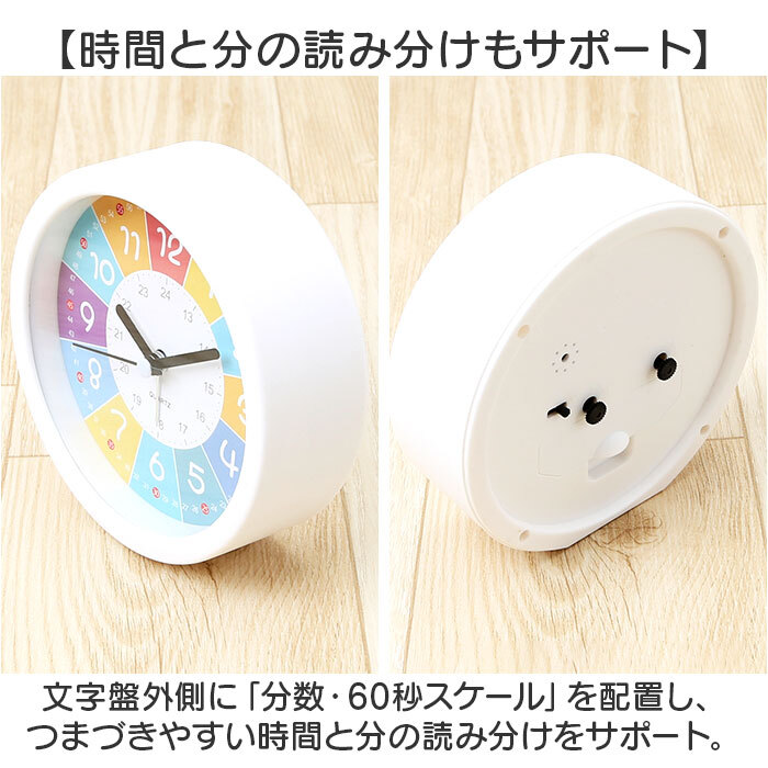 | 商品説明 | ・・【お子さまの時計学習にオススメ】 ・見やすい文字盤で、時計の読み方を楽しくお勉強!アラーム機能付き「知育・目覚まし時計」 ・【時間が見やすいカラフル仕様】 ・カラフルなレインボーカラーに配色された文字盤で、時間の感覚を直観的に学習できるつくり。 ・【時間と分の読み分けもサポート】 ・文字盤外側に「分数・60秒スケール」を配置し、つまづきやすい時間と分の読み分けをサポート。 ・【お子様の成長に合わせた時間学習に】 ・インデックス内側の「24時間スケール」で、より実生活に役立つ時間の読み方もマスター! ・【おやすみ時間を妨げない連続秒針】 ・時計のコチコチ音が気になって寝付けないお子さまでも安心な「連続秒針」機能を搭載。 ・【アラームですっきりウェイクアップ】 ・ピピピピッ、ピピピピッと可愛く鳴り響くアラームで、お寝坊さんでも毎朝の目覚めがスッキリ。 ・【こども部屋に最適のデザイン】 ・コロンと可愛い丸型と角に丸みのある四角タイプ、お部屋に合わせて選べる2つのフォルム。 ・【お子さまの“はじめての時計”に】 ・目に触れる場所に置いて時間の読み方が自然に身に付く♪アナログ時計に馴染みのない現代っ子に。 ・【電池仕様】 ・単3形乾電池1本使用。(電池は別売りです。) |