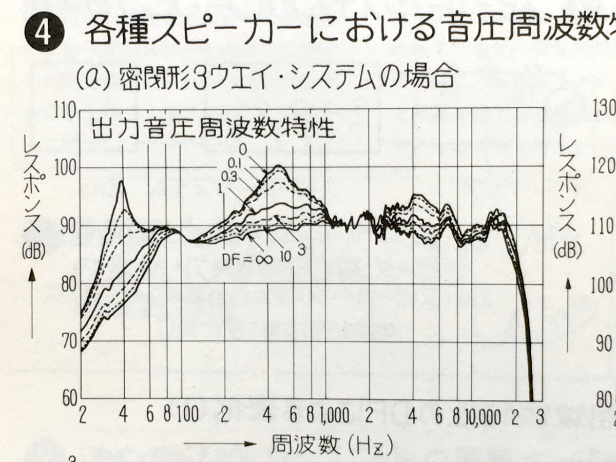 『各種スピーカーにおける音圧周波数特性』にあるようにDFが10以下になるとスピーカーの周波数特性が低域だけでなく中域・高域も激しく変化します。