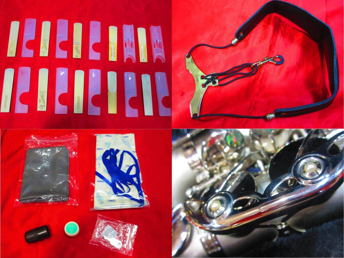 ・おまけとして、ヤナギサワ製マウスピース3番(小キズ、変色、印字消え有、ワレ・カケ・歯形無し)、オリジナルブランドリガチャー(彫刻入り、クロームメッキ、GLスクリュー、新品)、BGタイププラキャップ(新品)、モニター用リード10枚(バンドレン、セレクトジャズ、ゴンザレス、ammoon、他新品)、バードタイプストラップ(新品)、マイクロファイバークロス(L版新品)が付いています。