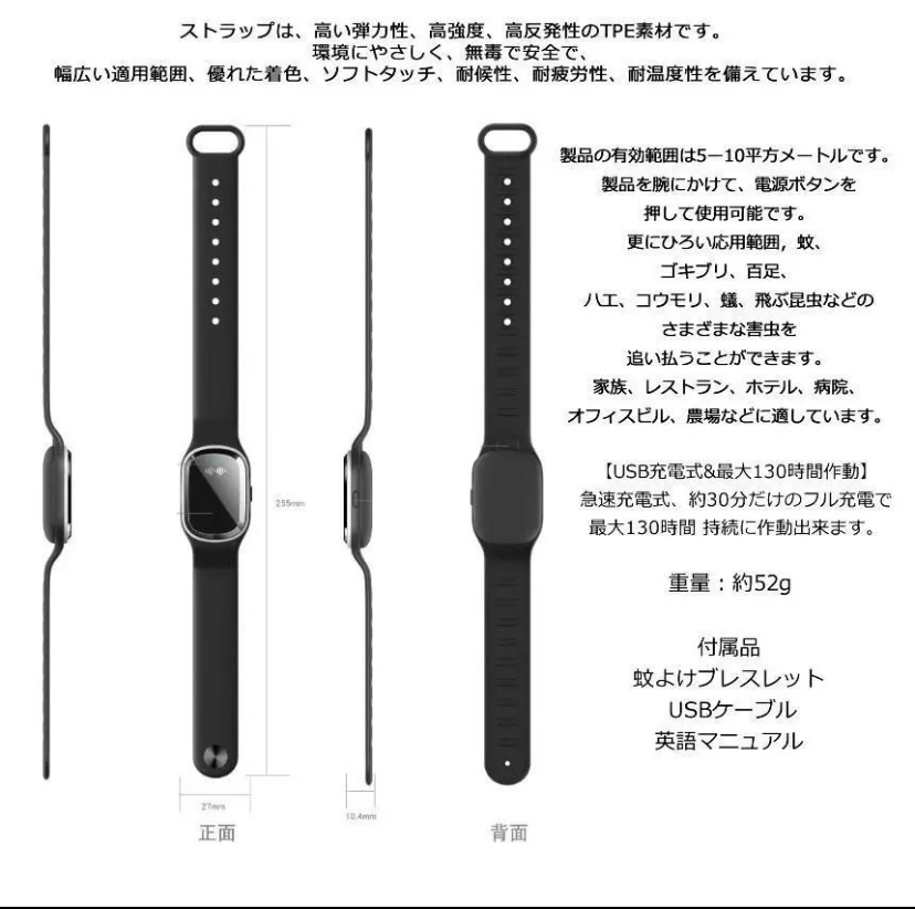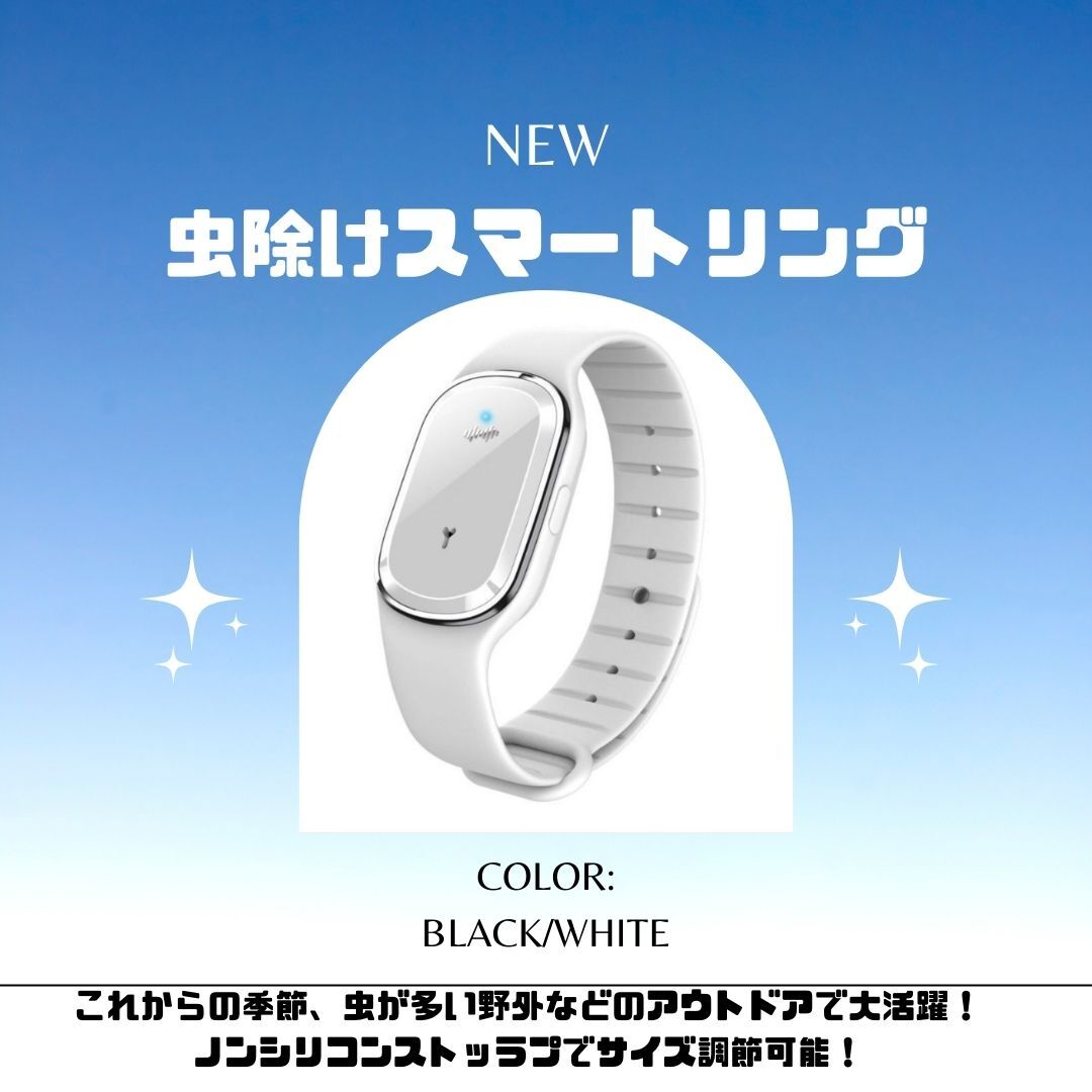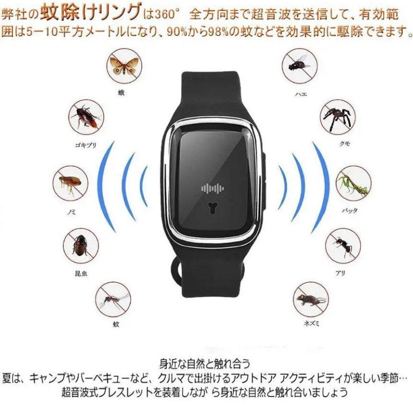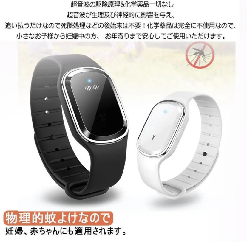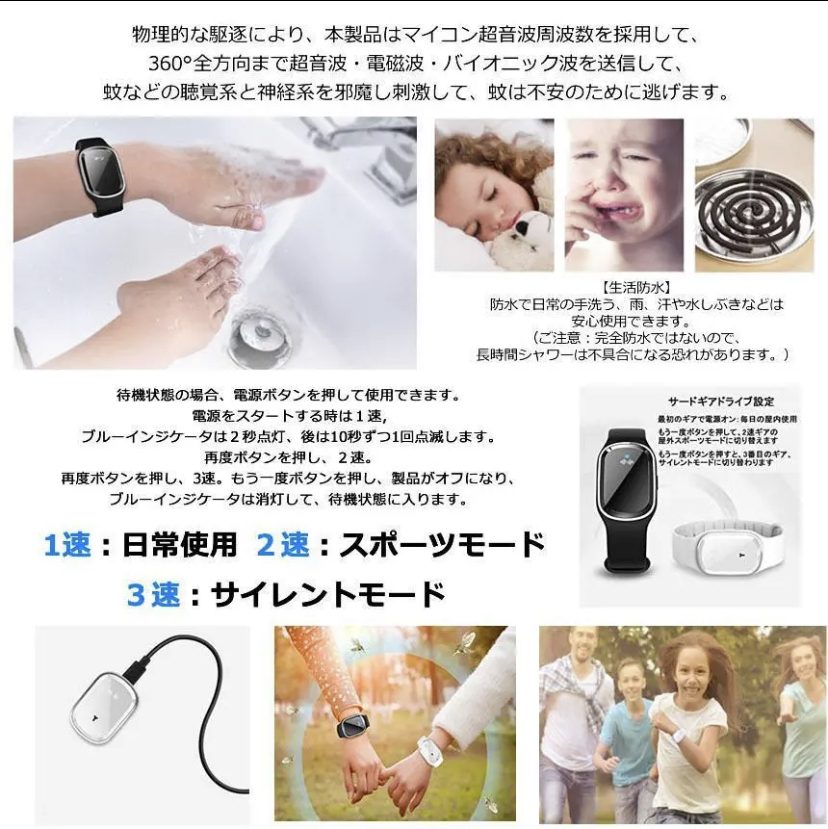 今話題のおすすめ商品!★カラー★ホワイト★プロ蚊よけ原理★本製品はマイコン超音波周波数を採用して、蚊などの嫌がる音をまねることで、蚊は不安のために逃げます。360°全方向まで超音波を送信して、有効範囲は5ー10平方メートルになり、90%から98%の蚊を効果的に駆除できます(使用場所によって、有効範囲が違います)。純粋な物理的蚊よけは、放射線なし、化学薬品ではなく、より安全で、より効果的で、より環境に優しく、より健康的です。★★3つのモード&省エネ★★1段階、日常の室内で蚊よけモード。2段階、アウトドア蚊よけモード。3段階、静音蚊よけモード。室内でも室外でも、昼でも夜でも、虫ささりを防ぎ、快適な夏を楽しむことができます。急速充電は30分程度で、連続して120-150時間の作業が可能です(使い方によって、連続時間が違います)。スマートチップ、インテリジェント駆逐、低電力全天運作、省エネ、無放射性の虫よけ製品でございます。★★防水★★微細な構造設計で、防水ができます。雨に濡れたり、手を洗ったりして、このまましても大丈夫です!!★★幅広い用途★★製品を腕にかけて、電源ボタンを押して使用可能です。肌に優しく、無毒で高品質な素材で、物理的蚊よけで、十分安全なので、高齢者、子供、妊婦、ペットがこのブレスレットを着用できます。そして屋内および屋外(海辺、公園、キャンプ、登山、釣り)で使用することができます。★★セット内容★★・本体ブレスレット1・ケーブル1・外国語説明書※発送に関して、新品でございますが、送料の関係上箱なし発送となります。ご理解、ご了承のほどよろしくお願いいたします。モニターや撮影環境により色味が違って見える場合がございますので予めご了承下さい。上記、ご了承の上ご購入くださいませ。