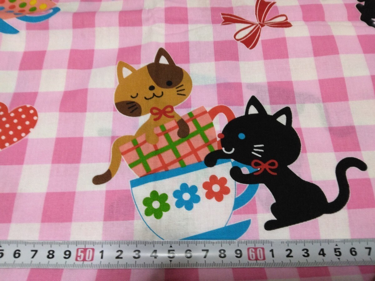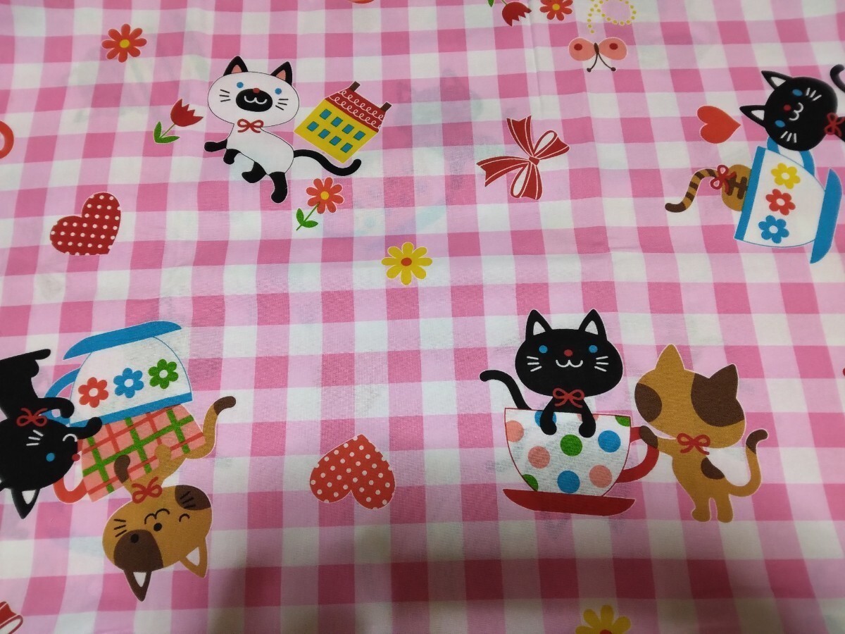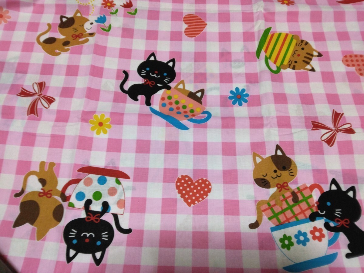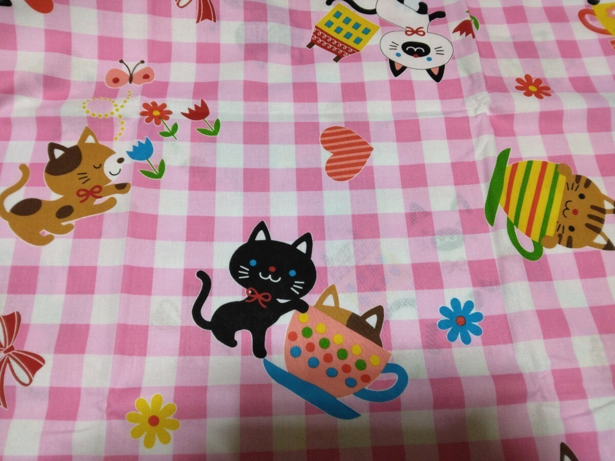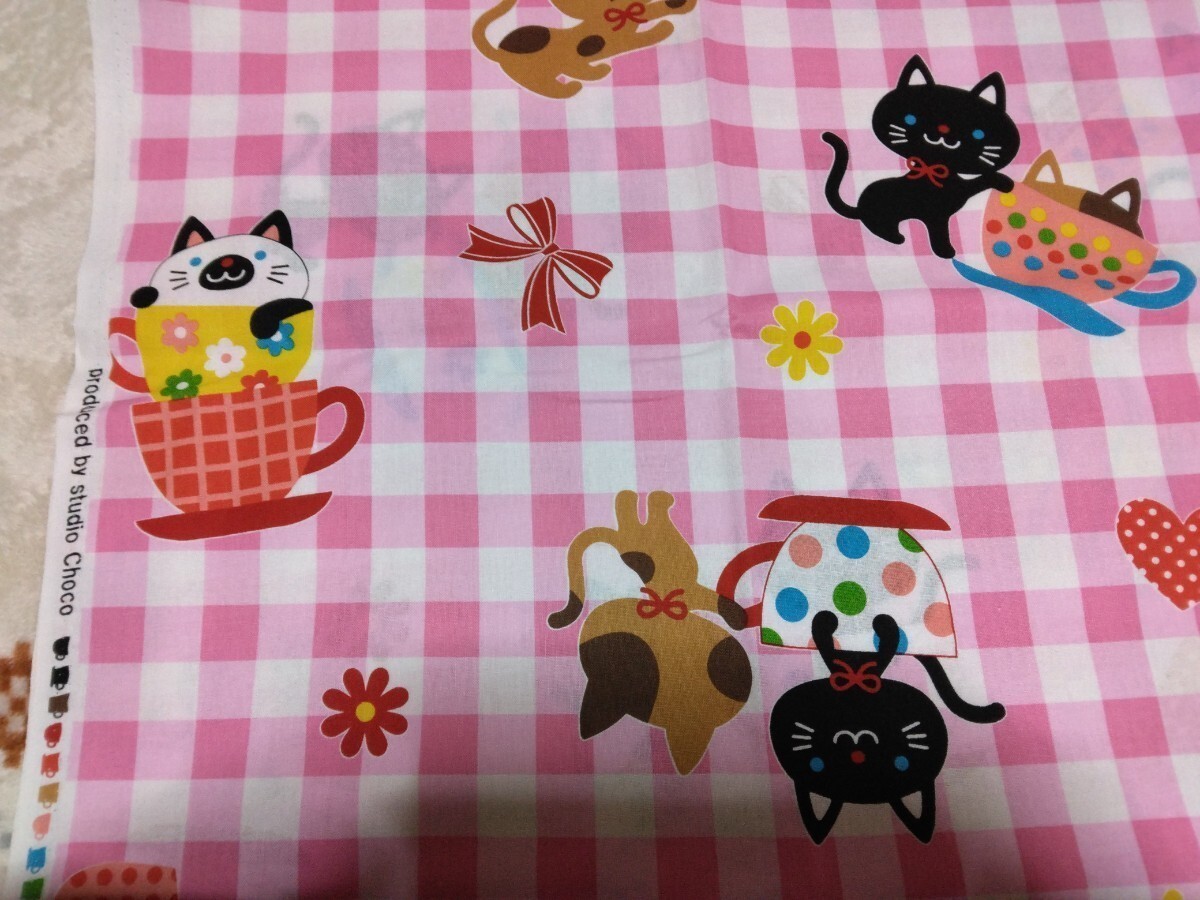 studio Chocoさんのカップインした可愛いネコちゃんとチェック柄の綿生地です。生地の詳細は不明ですが、シーチングぐらいの厚みです。