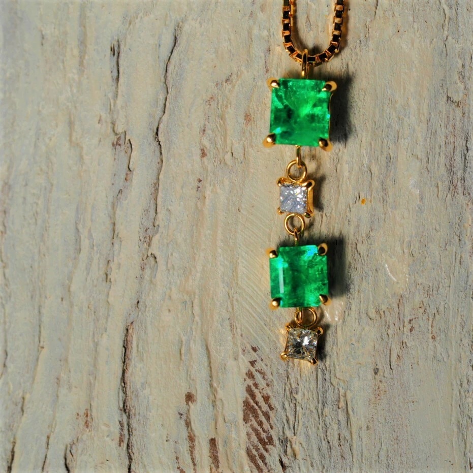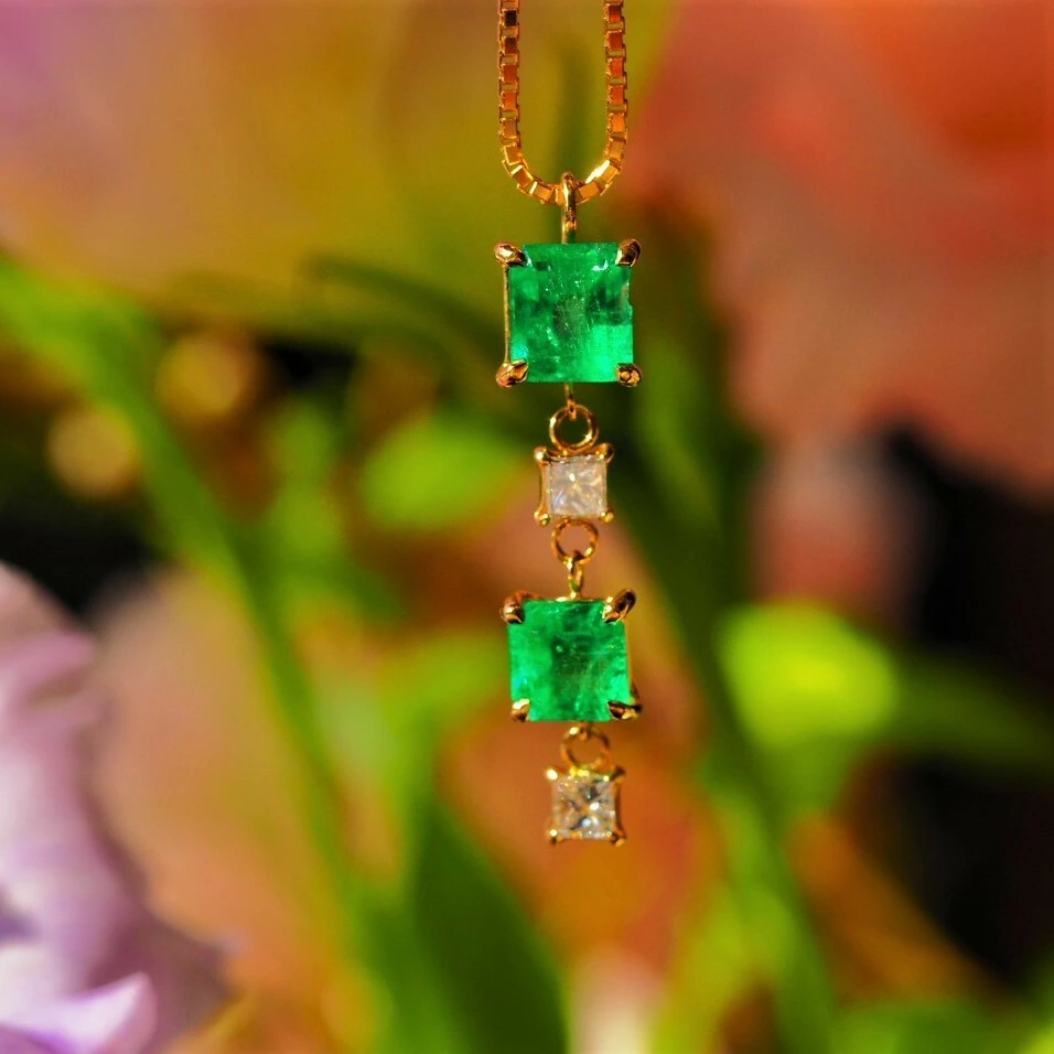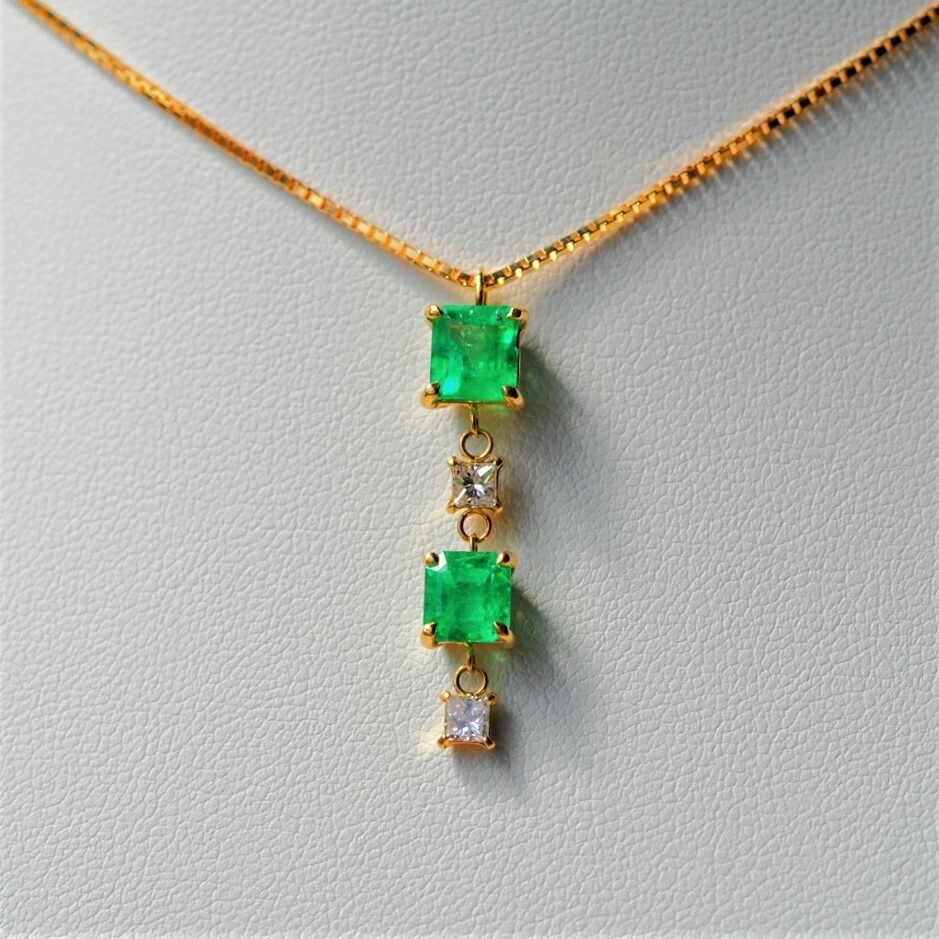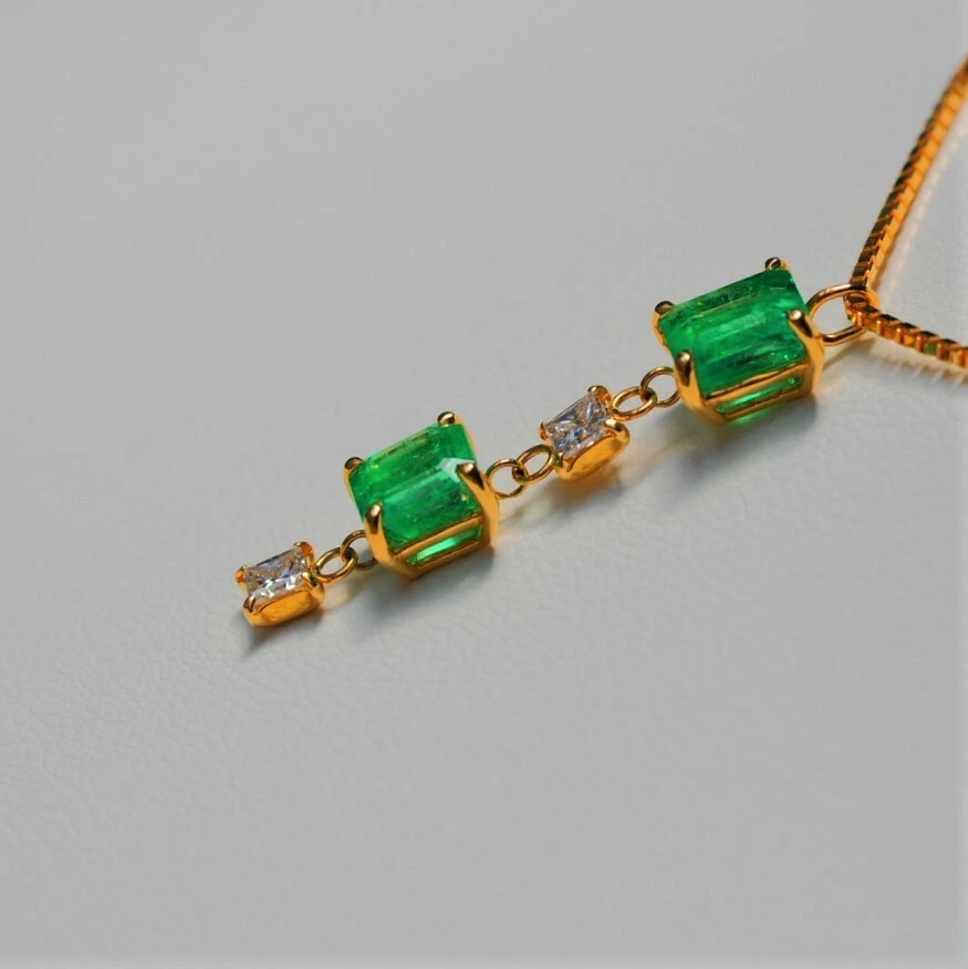 オイル処理をしていない、1.13カラットと0.90カラットの希少なエメラルドを組合わせてネックレスに仕上げております。