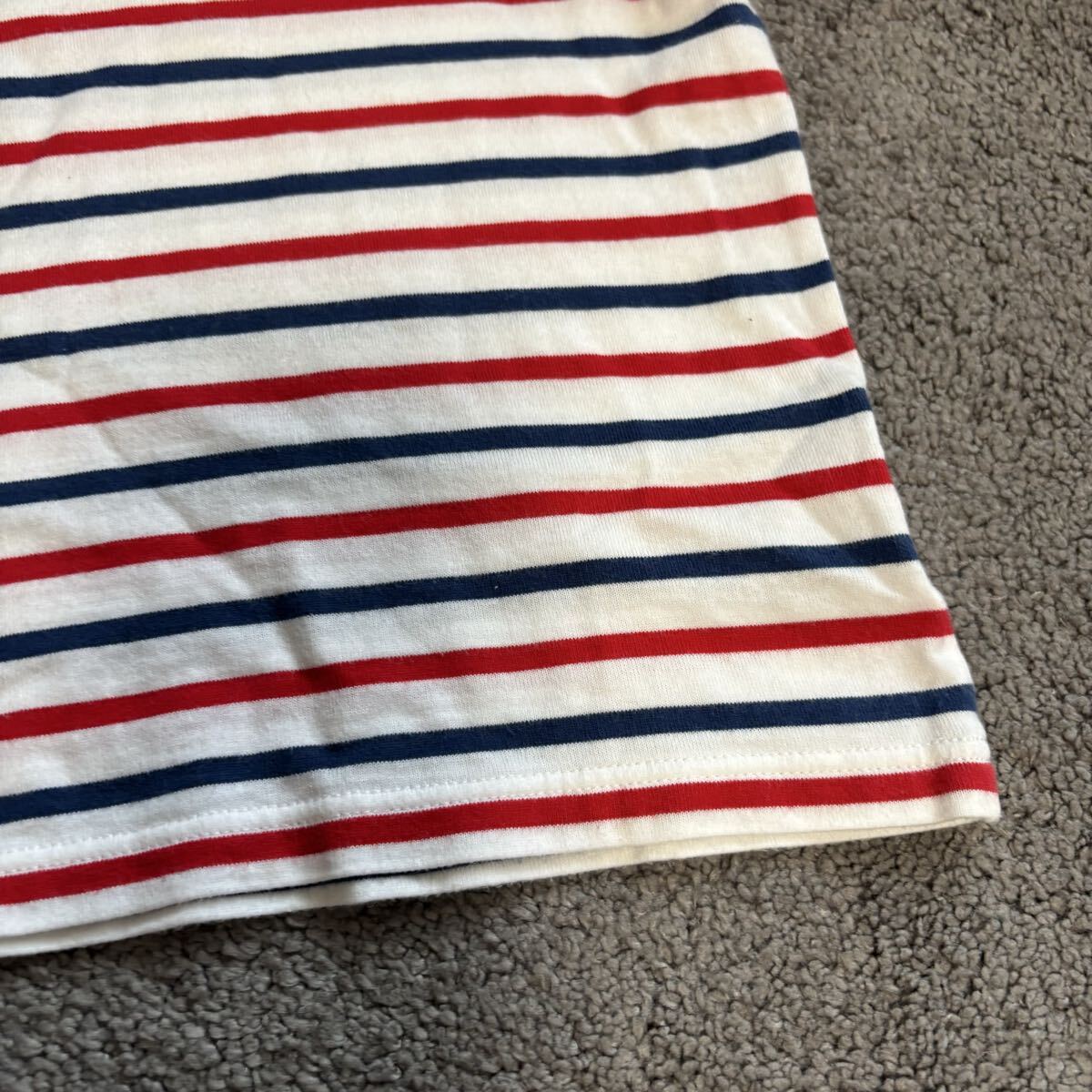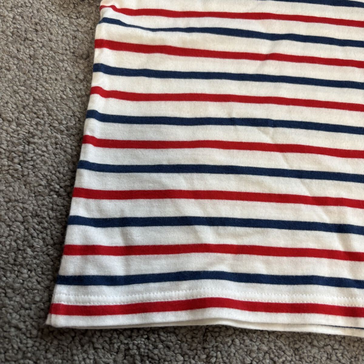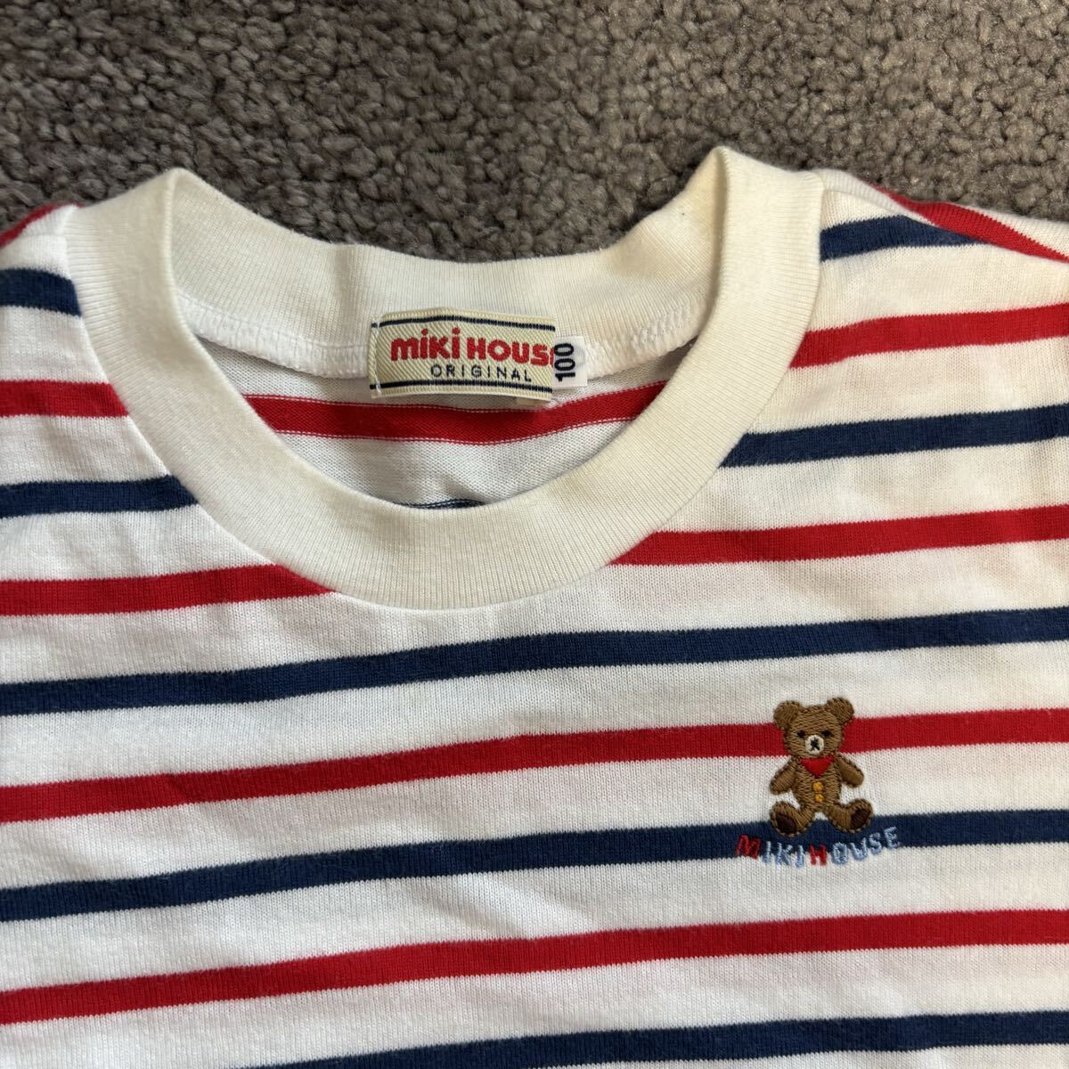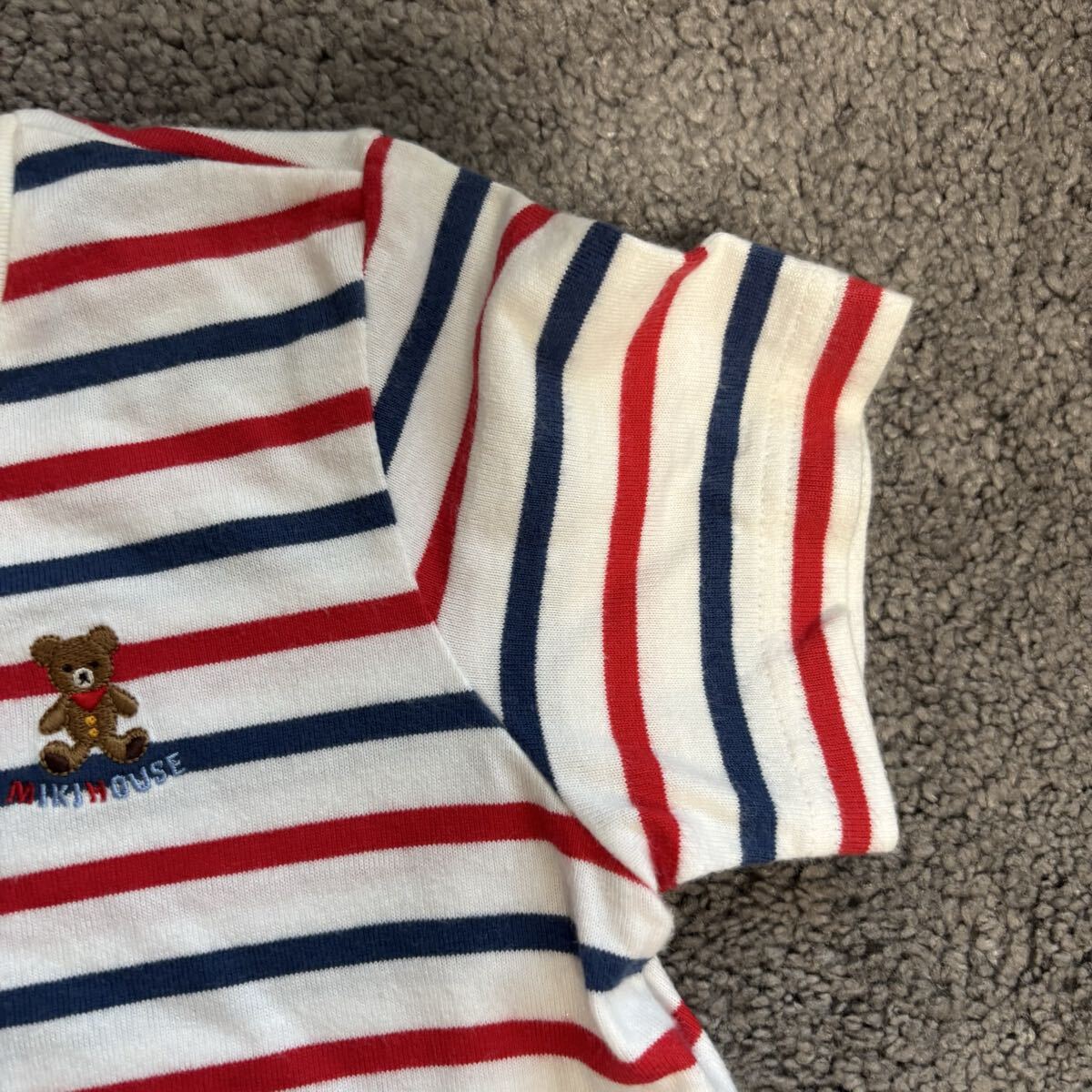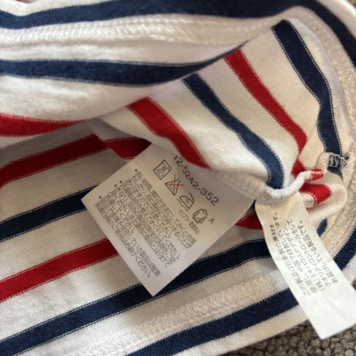ストライプデザインの110cm Tシャツ、クマの刺繍付き。