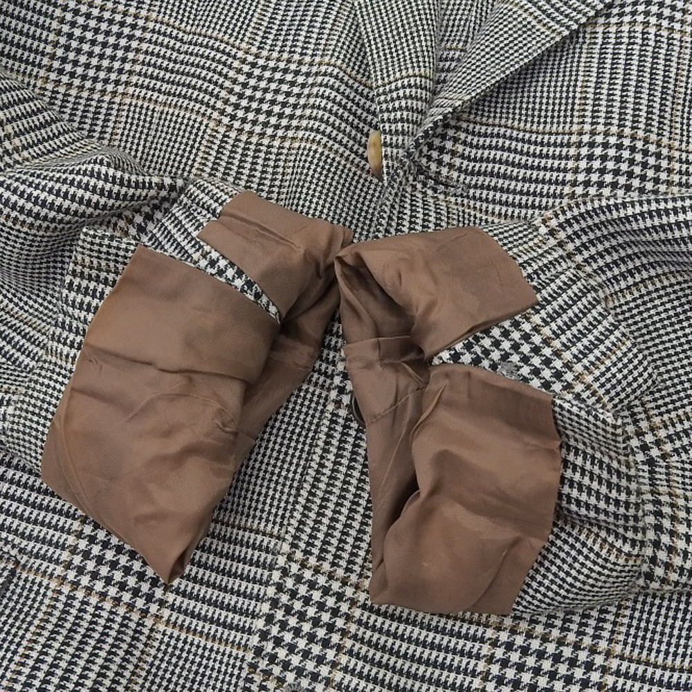 | 仕立てはシングル3釦、サイドベンツ、背抜き、見せ開き、キッスボタン、フラップポケット、ネーム刺繍 無 |