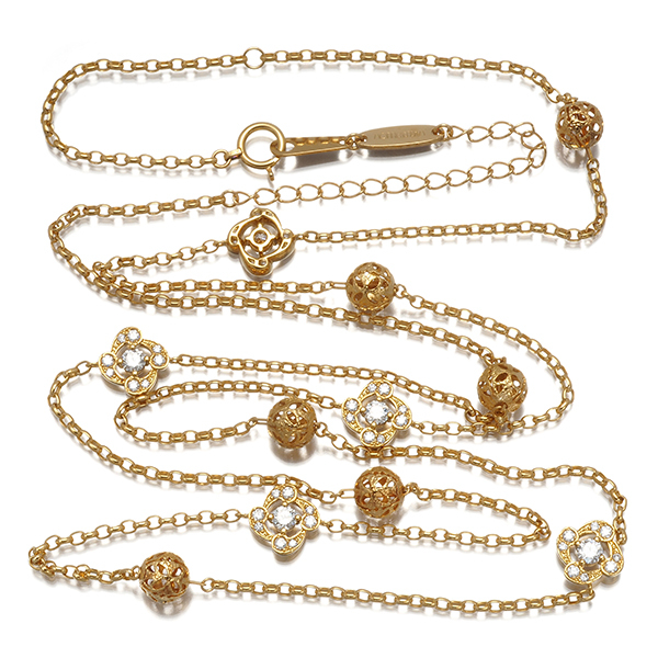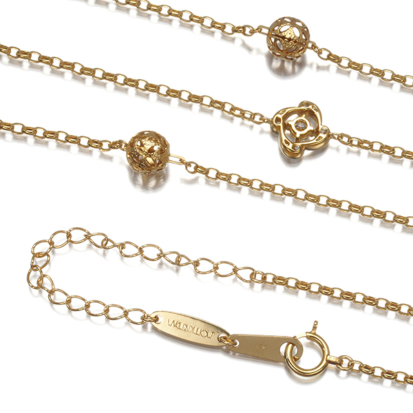世界三大ダイヤモンドカッターズブランドを冠する モニッケンダムならではの美しいダイヤモンドジュエリー。厳選ダイヤを飾った4つのモチーフと透かしをあしらったボールデザインをステーションに飾ったイングリッシュローズネックレスです。 |