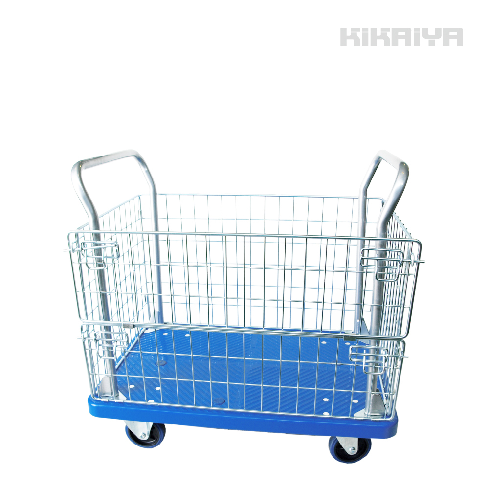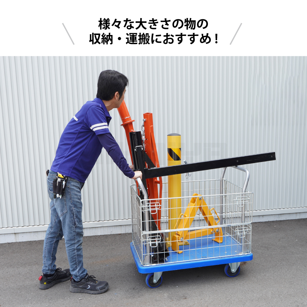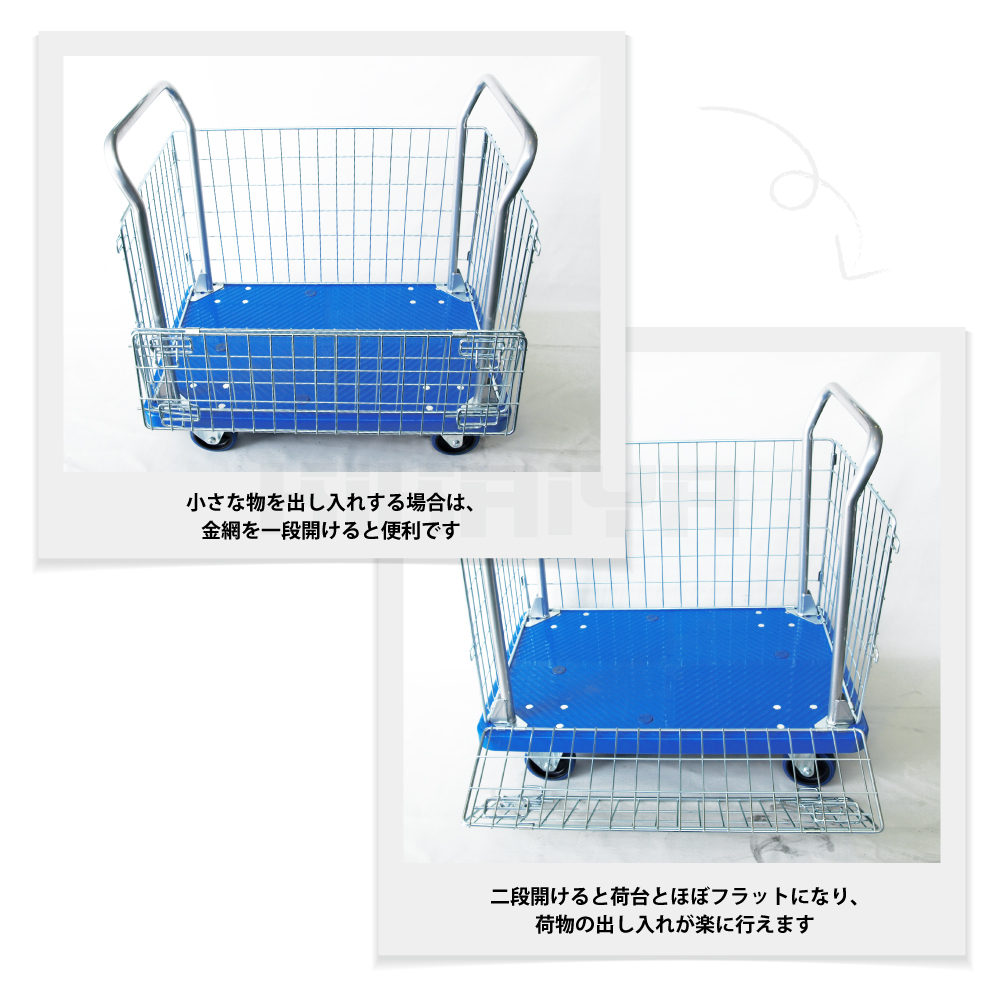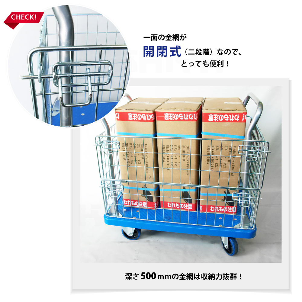 ●カゴ付台車は積み重ねにくい物や不安定な物を保管したり移動するのにおススメです ●一面の金網が開閉式(2段階)なので、荷物の出し入れの際にとっても便利です ●2段開けると荷台とほぼフラットになり、大きな荷物や重い物の出し入れも楽に行えます ●荷台表面はギザギザの滑り止め加工ゴム付(4か所) ●底面は樹脂製により水や錆に強く強度があります ●この商品はお客様組立てとなります ※カゴの組立てやキャスターの取付けに工具が必要となります |