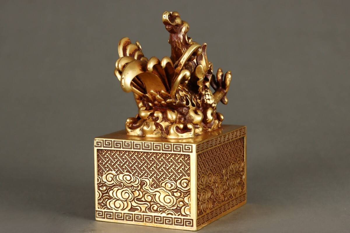 【瓏】古銅鏨刻彫 塗金朱雀 四方印章 清時代 古置物擺件 銅器 中国古賞物 蔵出