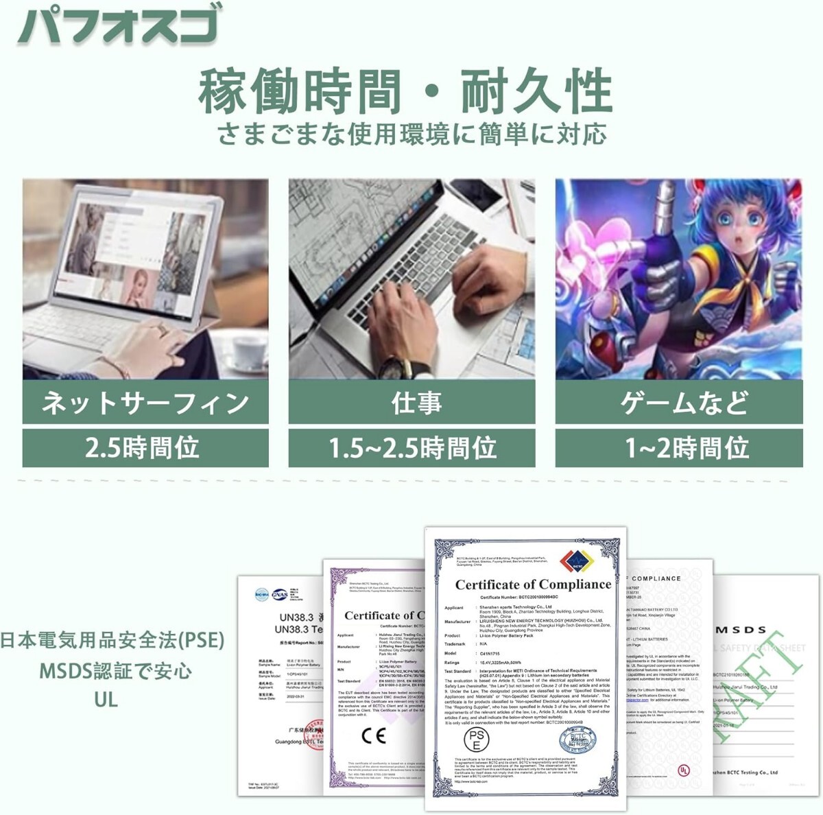 当社のASUS C41N1715batteryはPSE、CE、UL認証を取得しています。 コバルト酸リチウム、グラフェン、有機電解質などの先端材料を使用し、安全性、信頼性、環境性、耐久性、放熱ブロック、極めて膨張しにくいなど、日本・欧州・米国で義務づけられている安全性試験をクリアし、安心して購入できるバッテリーです。