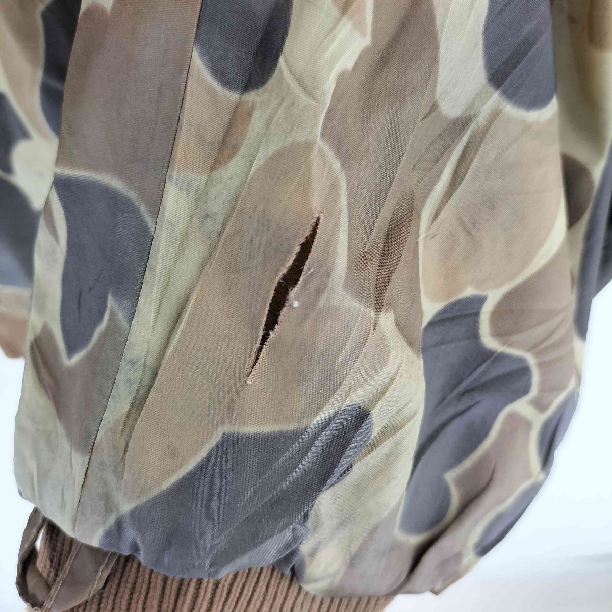 | 状態詳細 | 柄面フロント、袖、背面に汚れ、左袖先付近に3cmほどの破れ、25cmほどのリペア痕、右ポケットにダメージ、3cmほどの破れ、左肩付近に小穴、テカリ、無地面背面に薄汚れ、リブに毛羽立ちがございます。 |