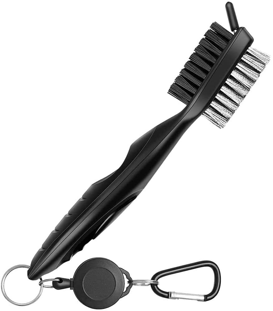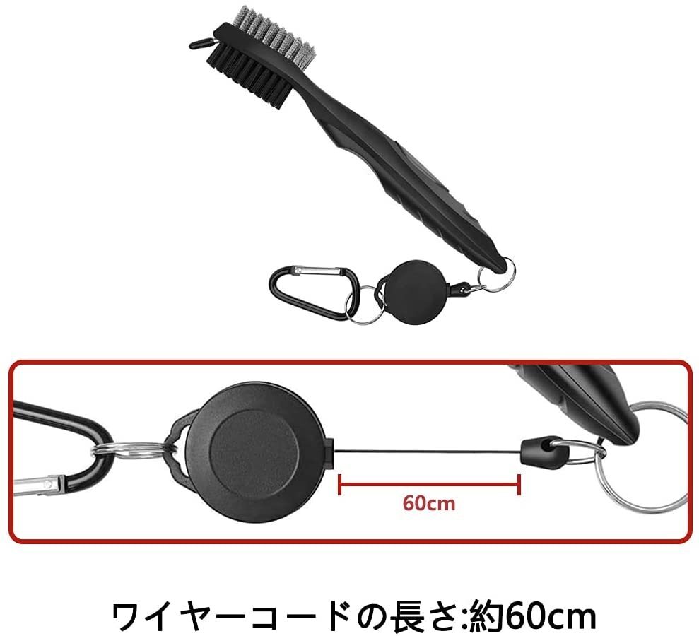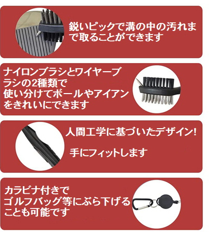 ゴルフウェッジ・アイアン クリーナー ゴルフはクラブのコンディションがすごく重要です。 バンカーの砂、芝などウェッジ、アイアンの溝に詰まったものをキレイに!! ボールコントロールがうまくいかないとお悩みの方、 溝の補修で以前のようなショットやアプローチが戻ってくるかもしれません。 2種類のブラシで汚れをしっかり取り除き、大切なゴルフ用品を長持ちさせてくれます。 溝の奥の汚れまでしっかり取り除くスパイクが先端に。靴の汚れ落としにも使用可能! 伸縮リール付き・カラビナ付きなのでバッグにつけたままでも使用できます。 気持ちの良いラウンドの為の必需品です!!