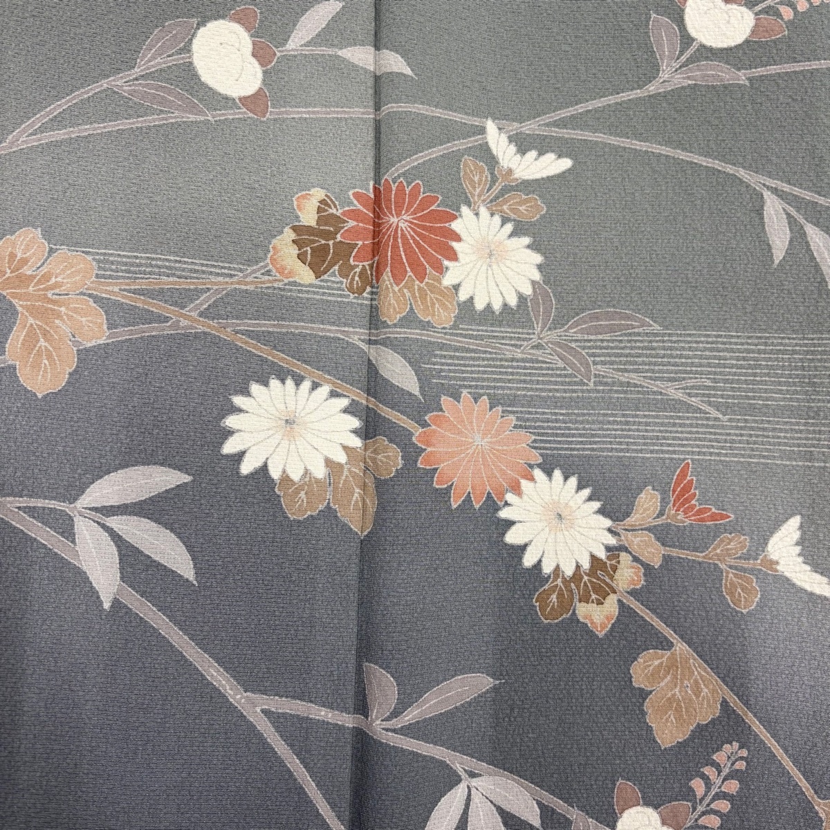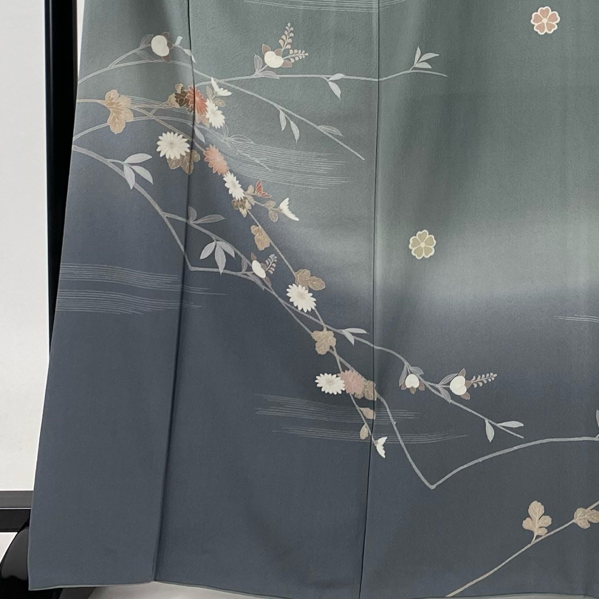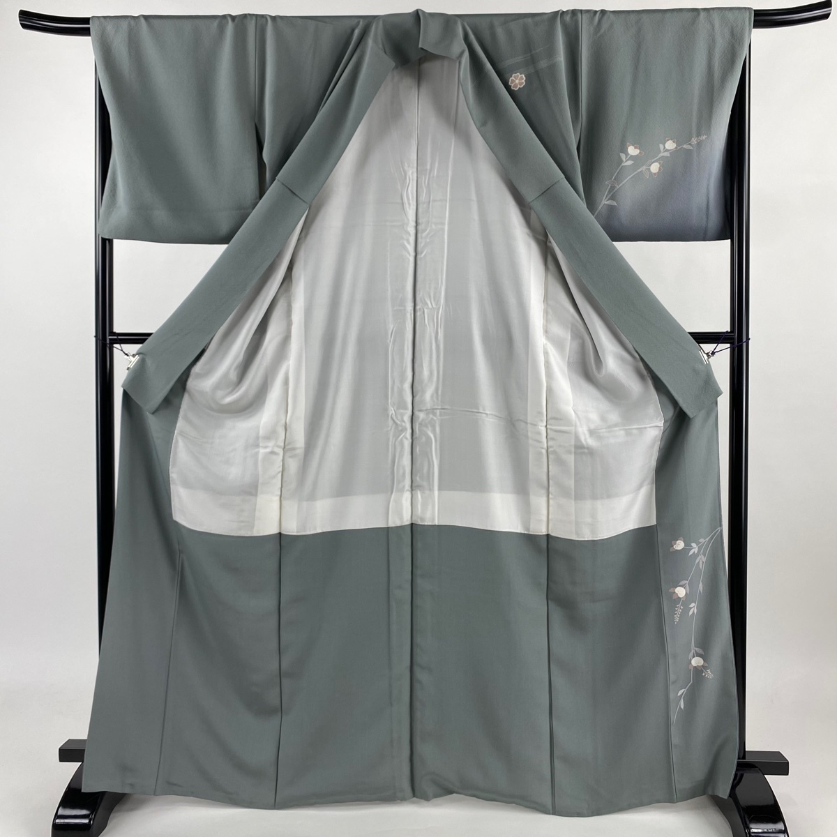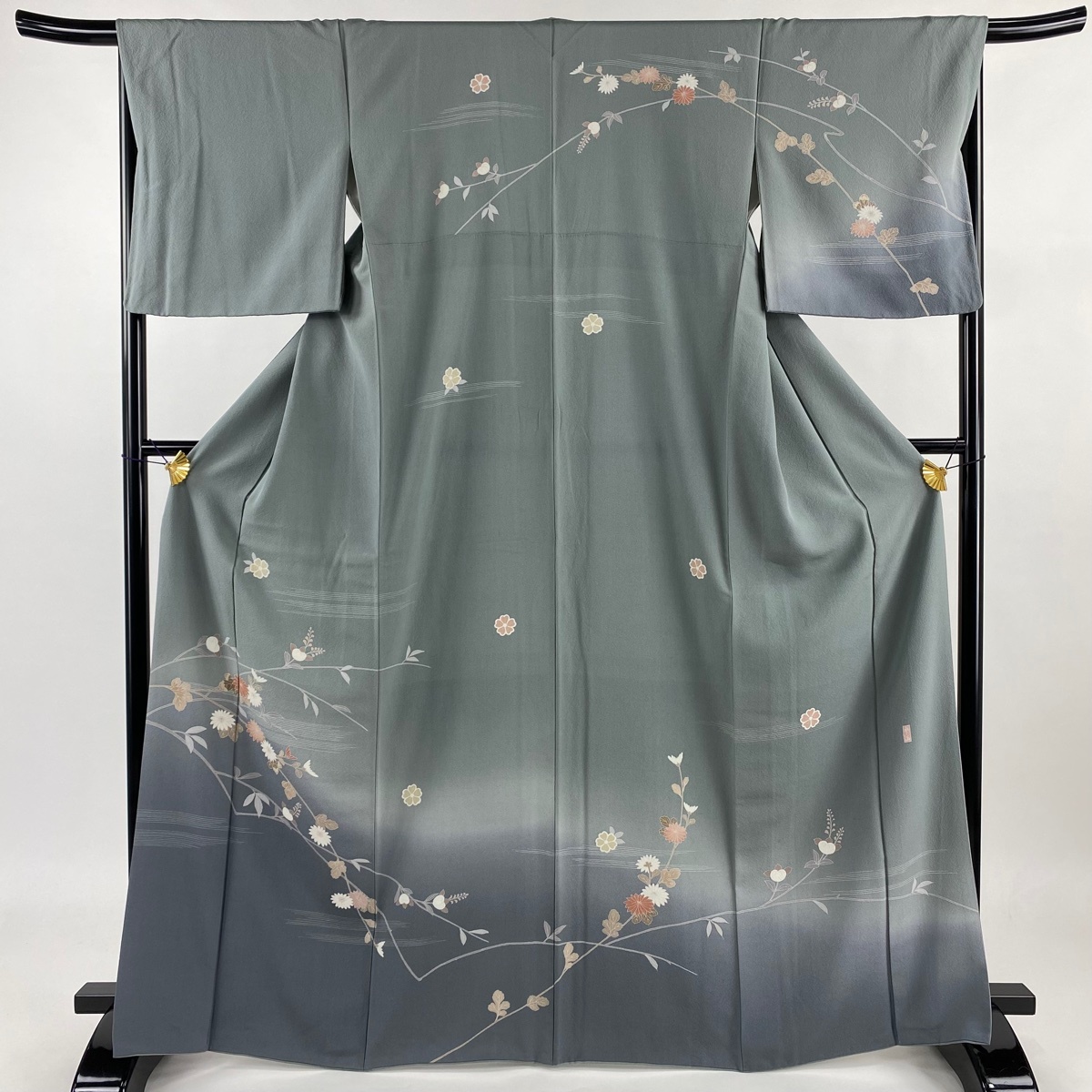 | 訪問着 秀品 落款 橘 菊 染め分け ぼかし 灰緑 袷 身丈167 裄丈67.5 L 正絹 【中古】 |