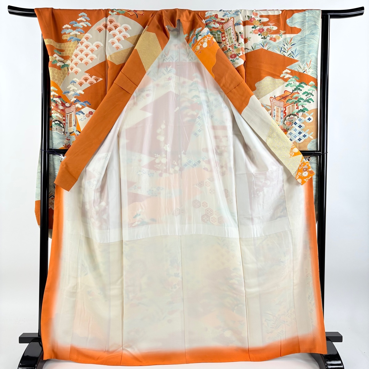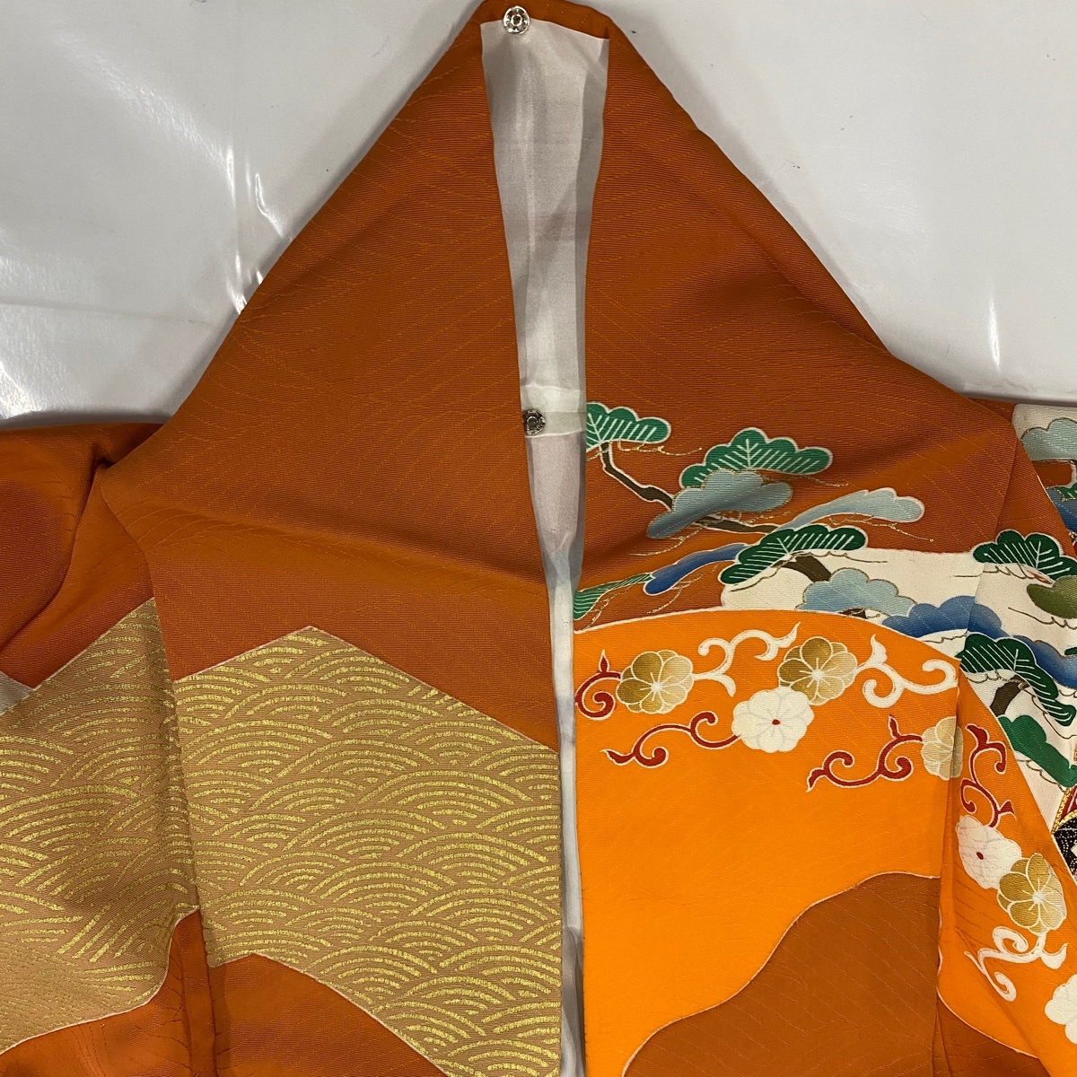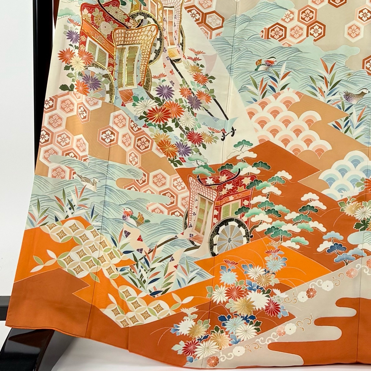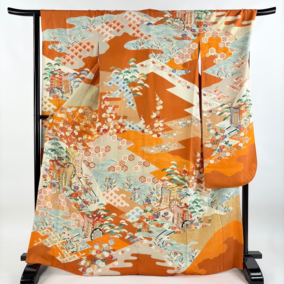 | 振袖 秀品 御所車 松梅 金糸 金彩 オレンジ 袷 身丈168 裄丈67 M 正絹 【中古】 |