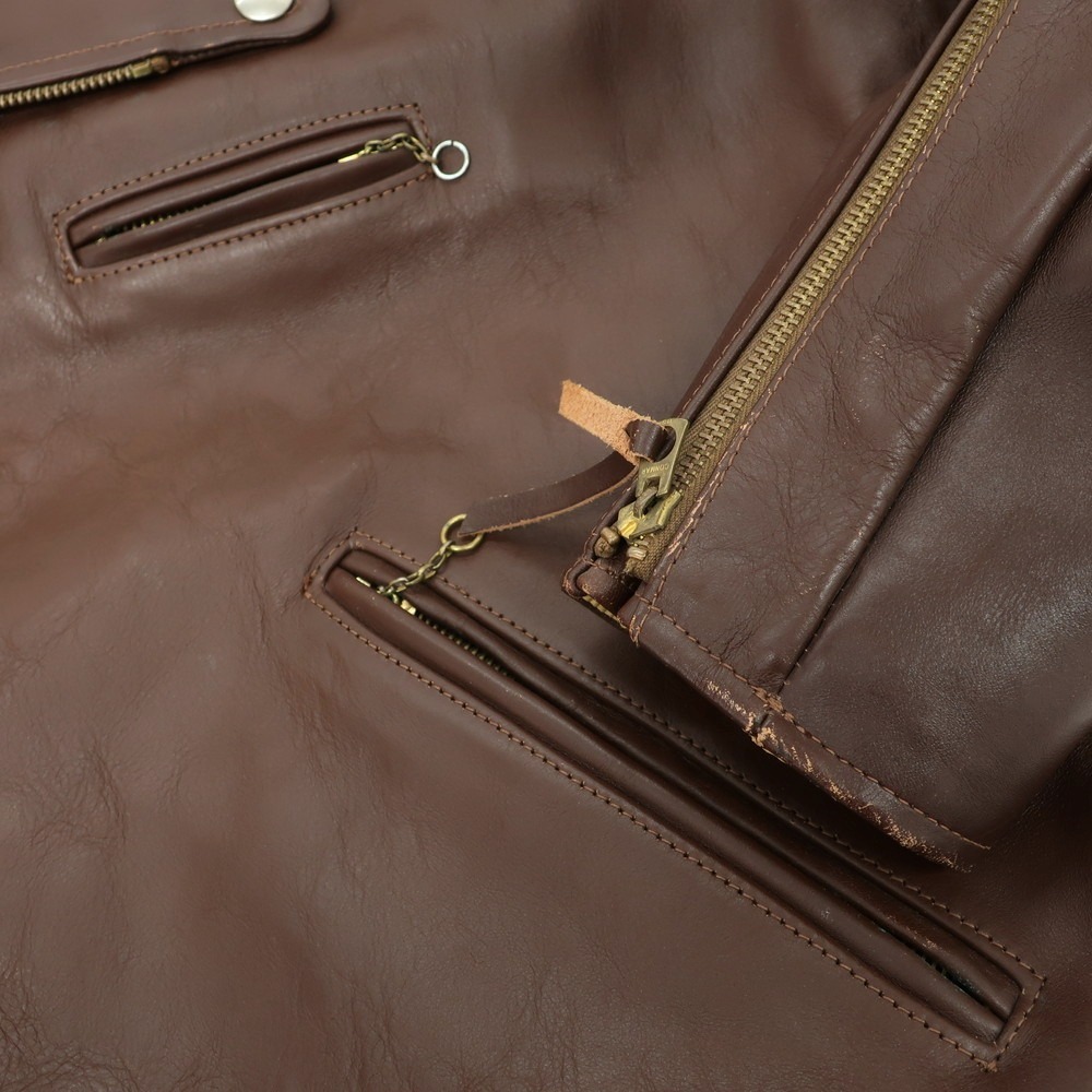 リアルマッコイズのJH-1ライダースジャケット。CONMARジップを用いた初期のモデルになりまして、風合い豊かなホースレザーが、重厚な雰囲気を演出しています。内側にはウール系の裏地が付き、保温性にも秀でています。着るほどに味わいを増す、まさしく一生物と呼んで差し支えない一着に仕上がっています。
