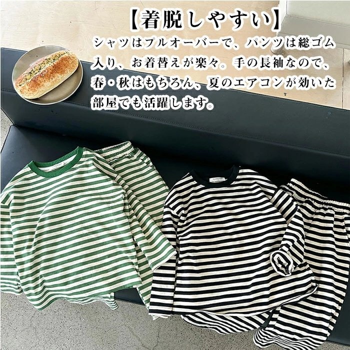 【着脱しやすい】シャツはプルオーバーで、パンツは総ゴム入り、お着替えが楽々。手の長袖なので、春・秋はもちろん、夏のエアコンが効いた部屋でも活躍します。