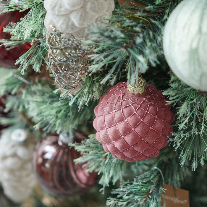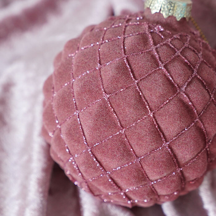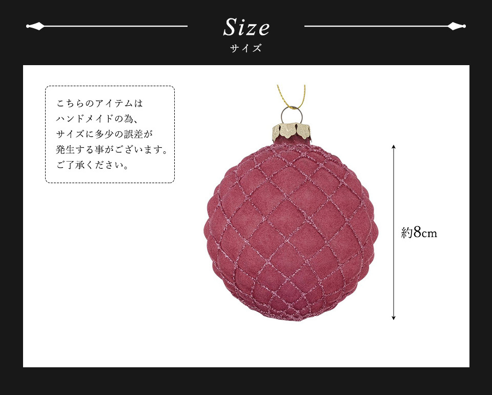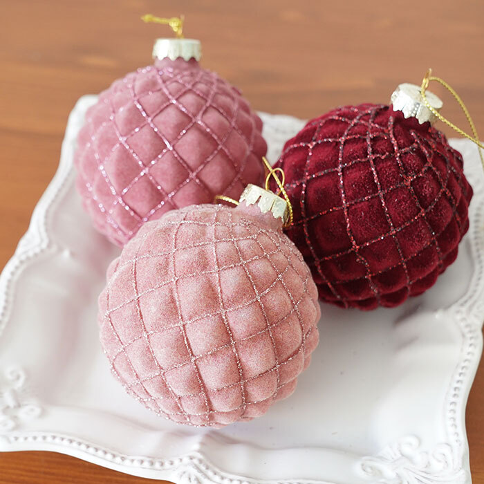 ガラスボールの表面にはフロック加工が施されていて、まるでビロードのような上品な手触りと深い光沢があります。