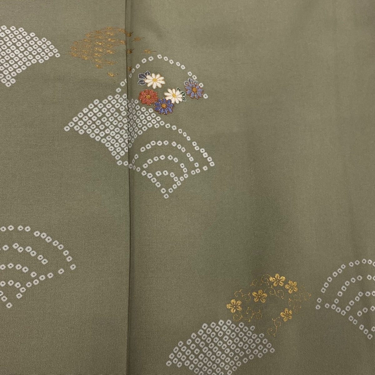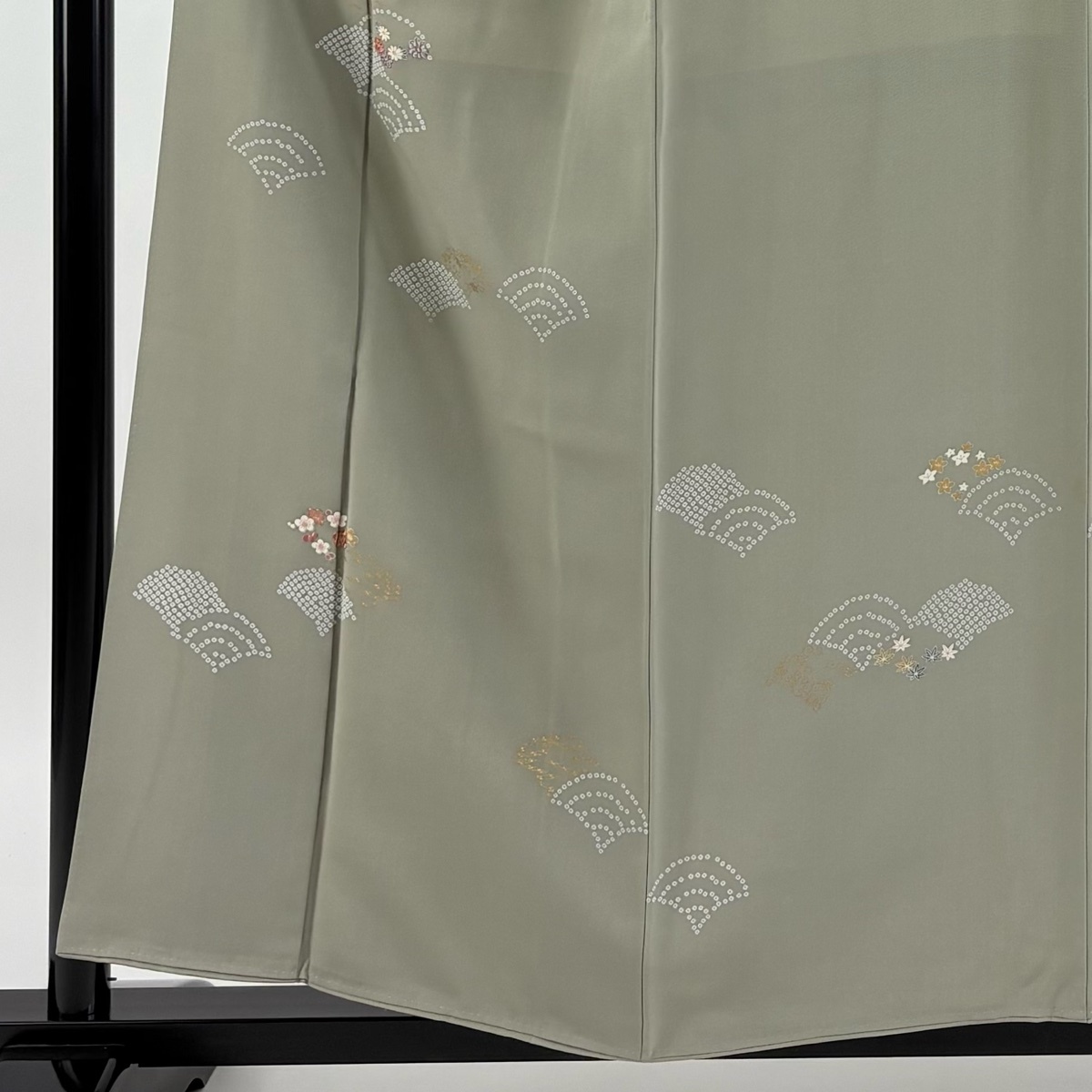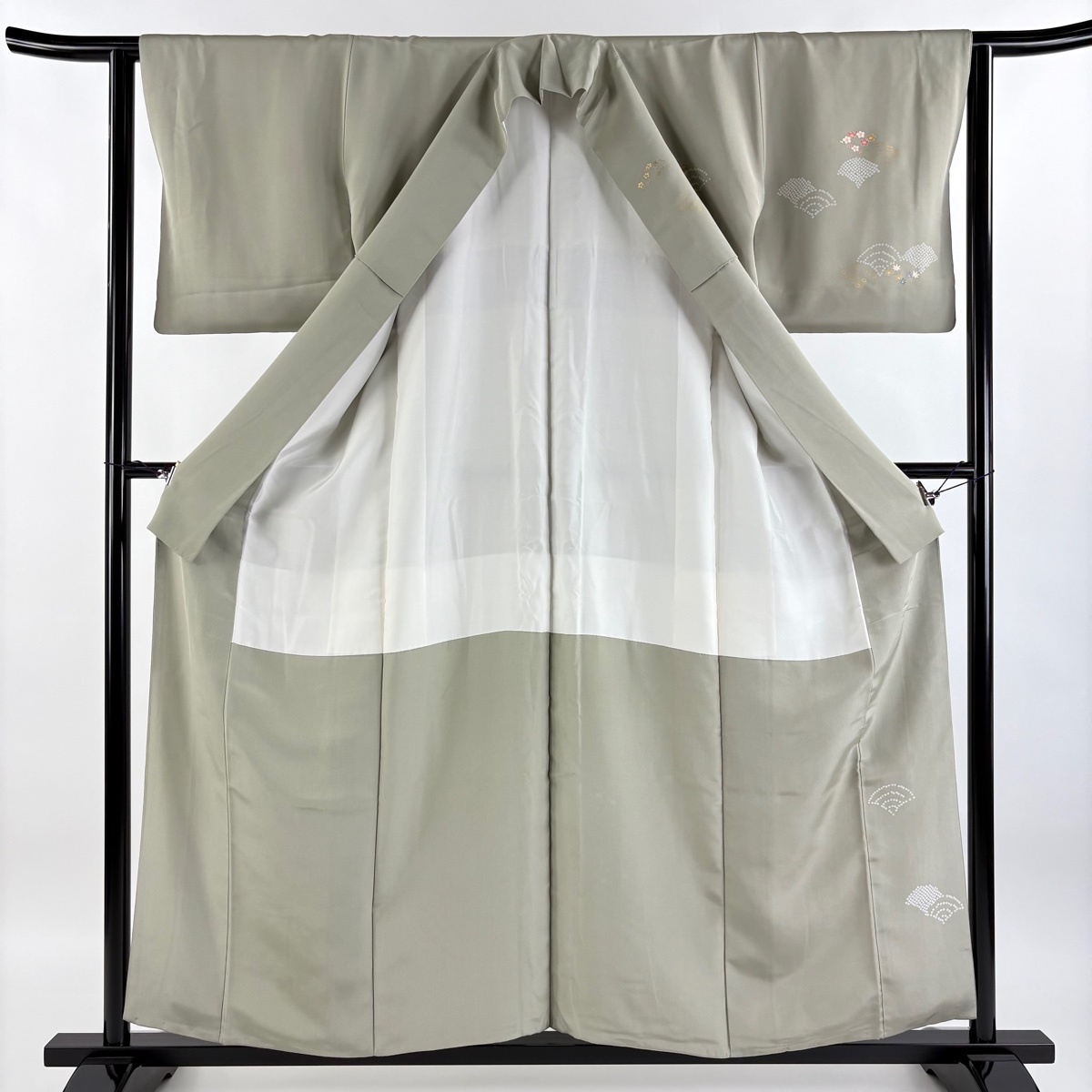 付下げ 秀品 草花 青海波 刺繍 金彩 灰緑 袷 身丈156.5 裄丈63.5 S 正絹 【中古】 |