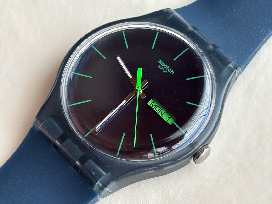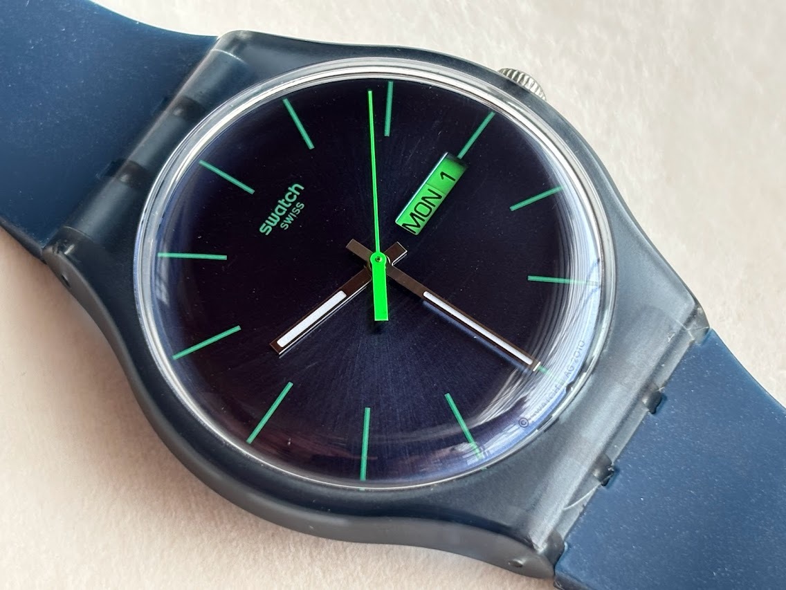 ダークネイビーダイアルの中で、グリーンの針、インデックスバー、デイト表示がオシャレです。