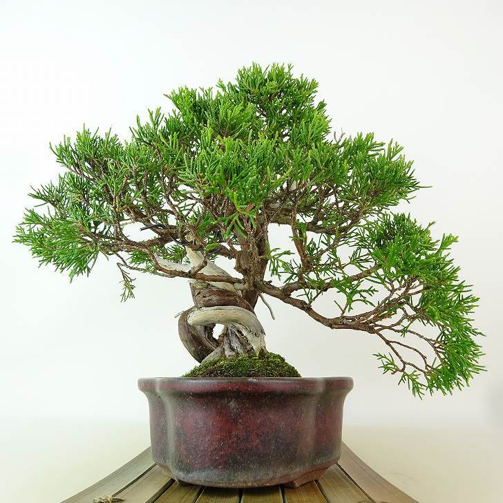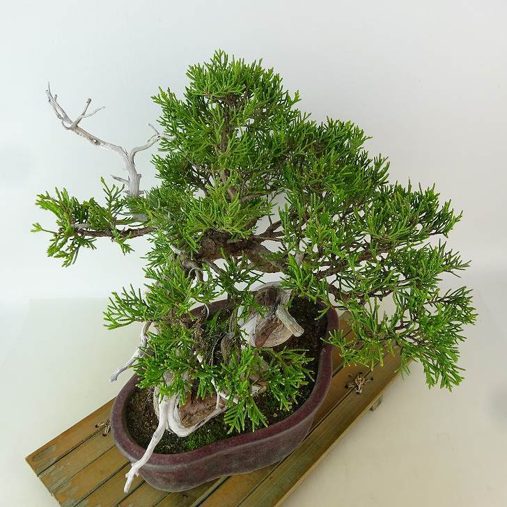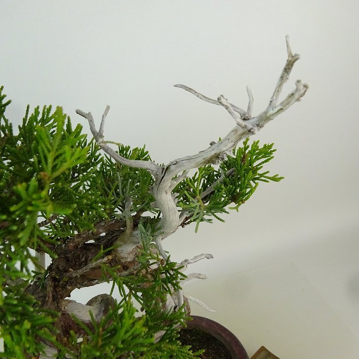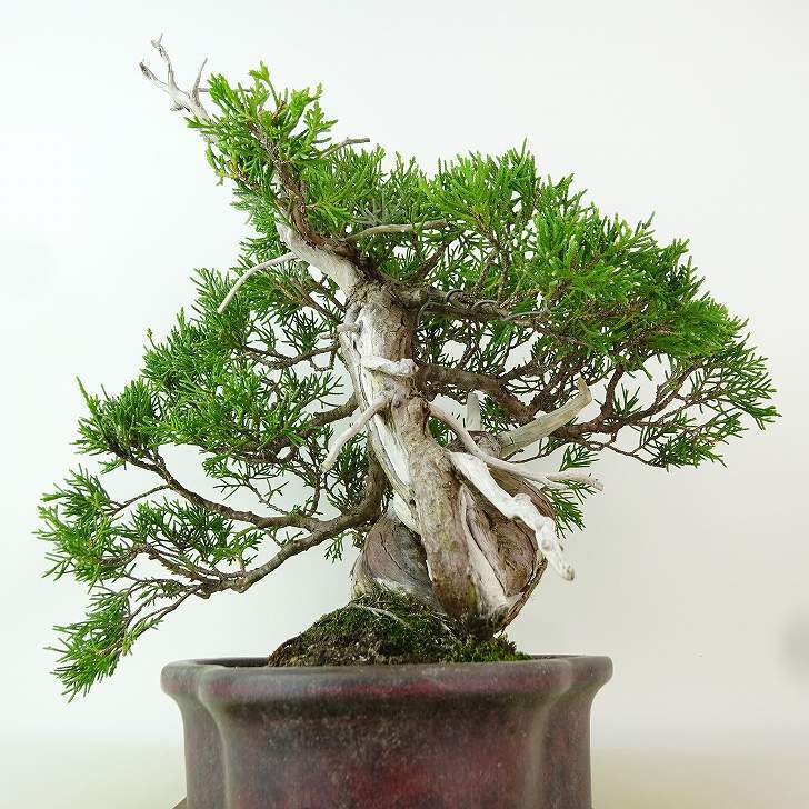 ■植物ですので撮影時期や季節によって剪定などの手入れにより写真から変化がございます。撮影日をご確認のうえ、ご注文ください。 ■年に一度、冬頃にジン・シャリのお手入れをおこなっています。薬品の関係で黄色く変色しているようにみえる場合がありますが徐々に薄れていくので問題はありません。 【真柏盆栽】 シンパクの1番の特徴と言えば、短く締った紐状の葉と、わずかな水吸いでも生き抜くことができる強靱な幹枝です。自然界では積雪や強風などで押しつぶされ木部が露出し、朽ちて白骨化したものが見られます。枝の一部が白骨化したものを神(ジン)、幹の場合は舎利(シャリ)といいます。 |