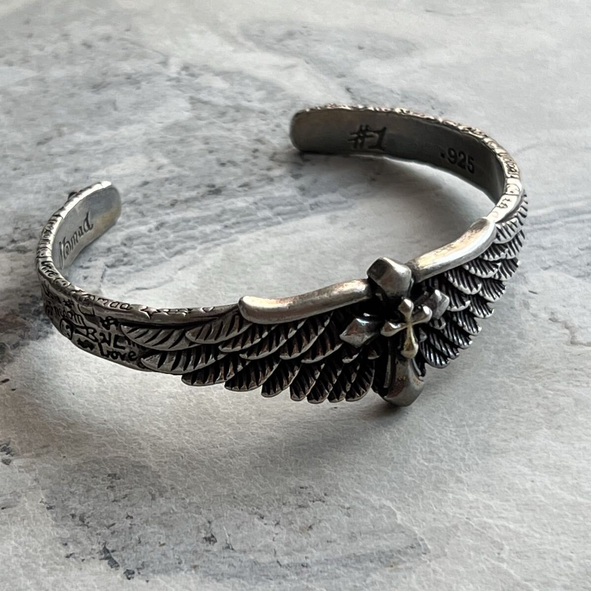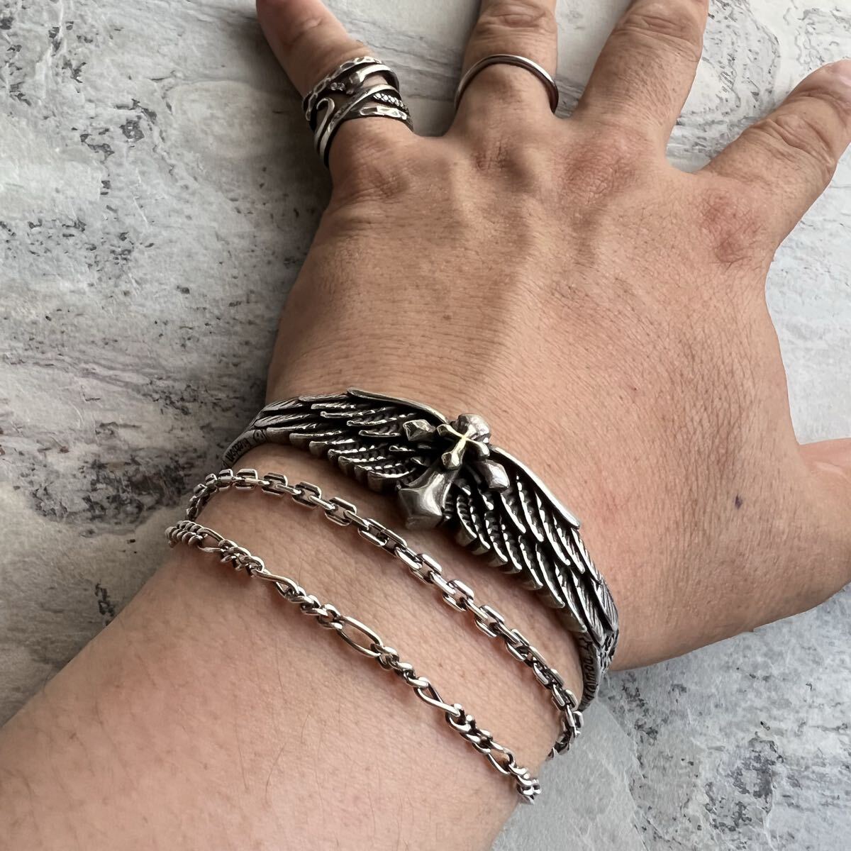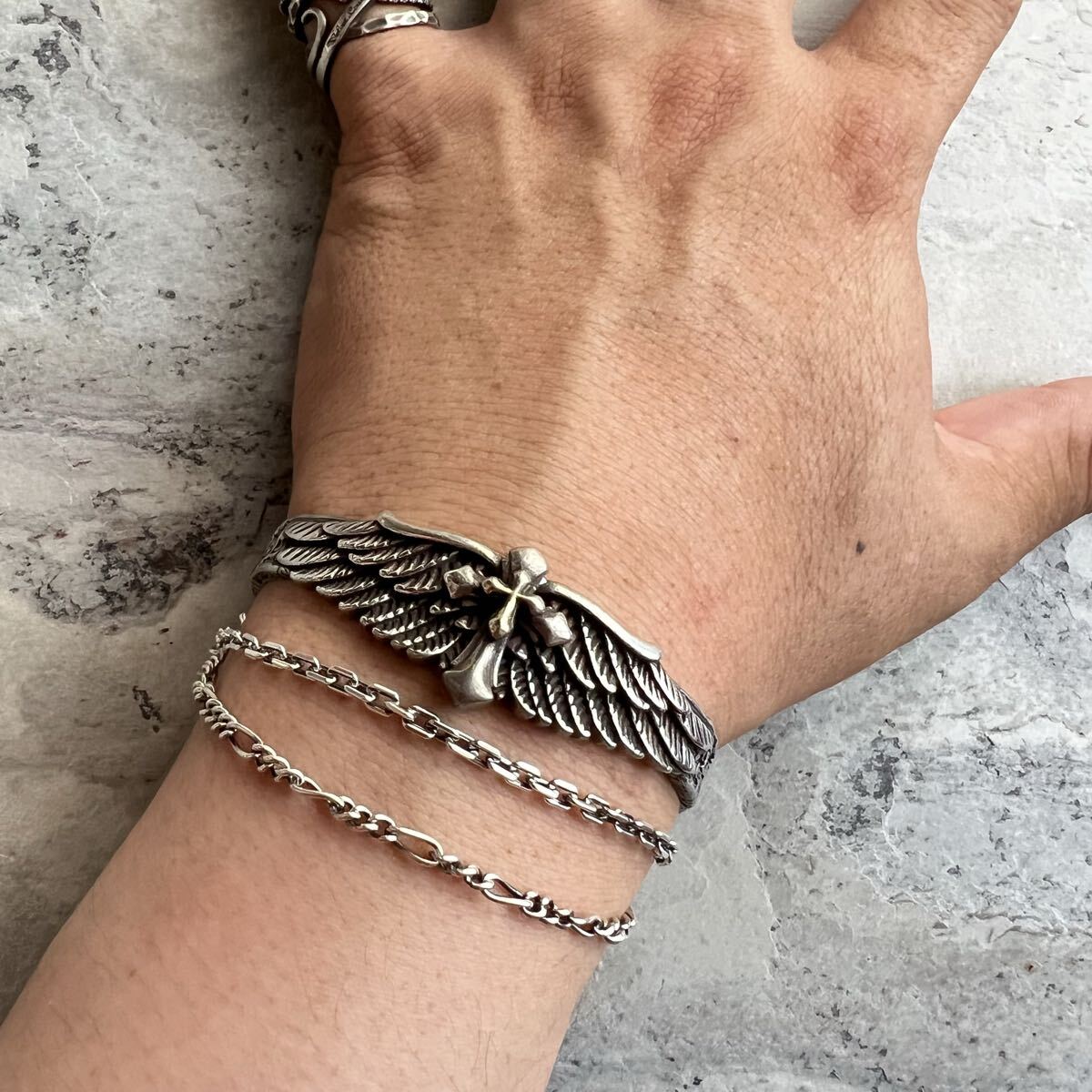 重厚感がありつつどんなファッションにも馴染むフェザーデザインがお洒落なバングルです。