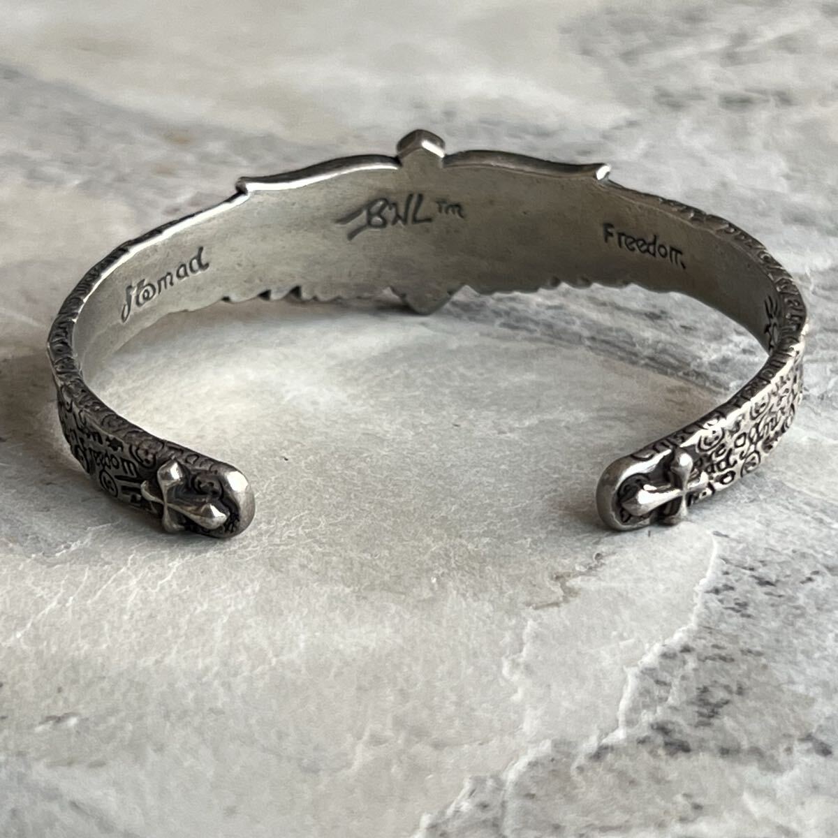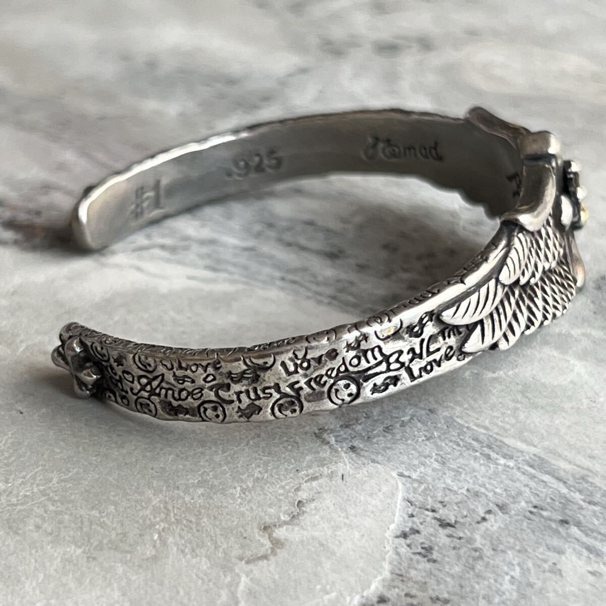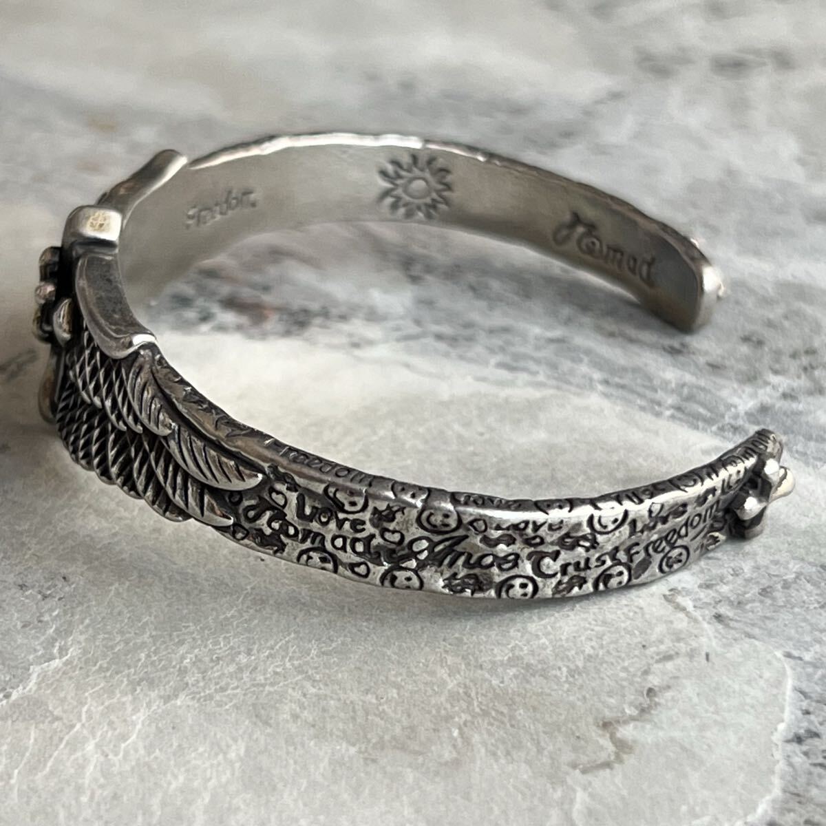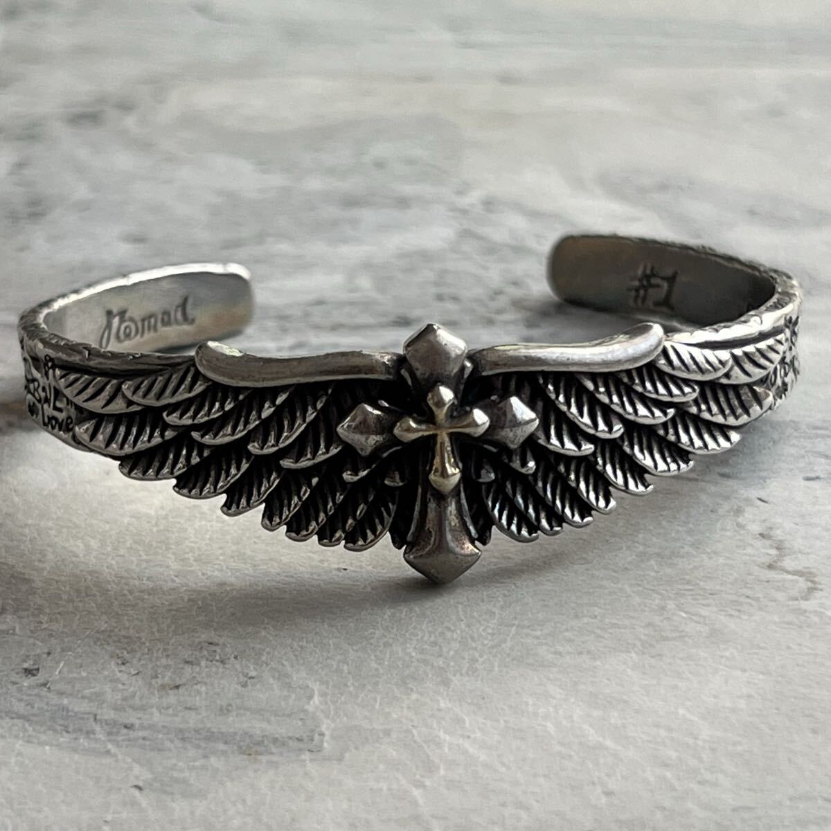 重厚感がありつつどんなファッションにも馴染むフェザーデザインがお洒落なバングルです。