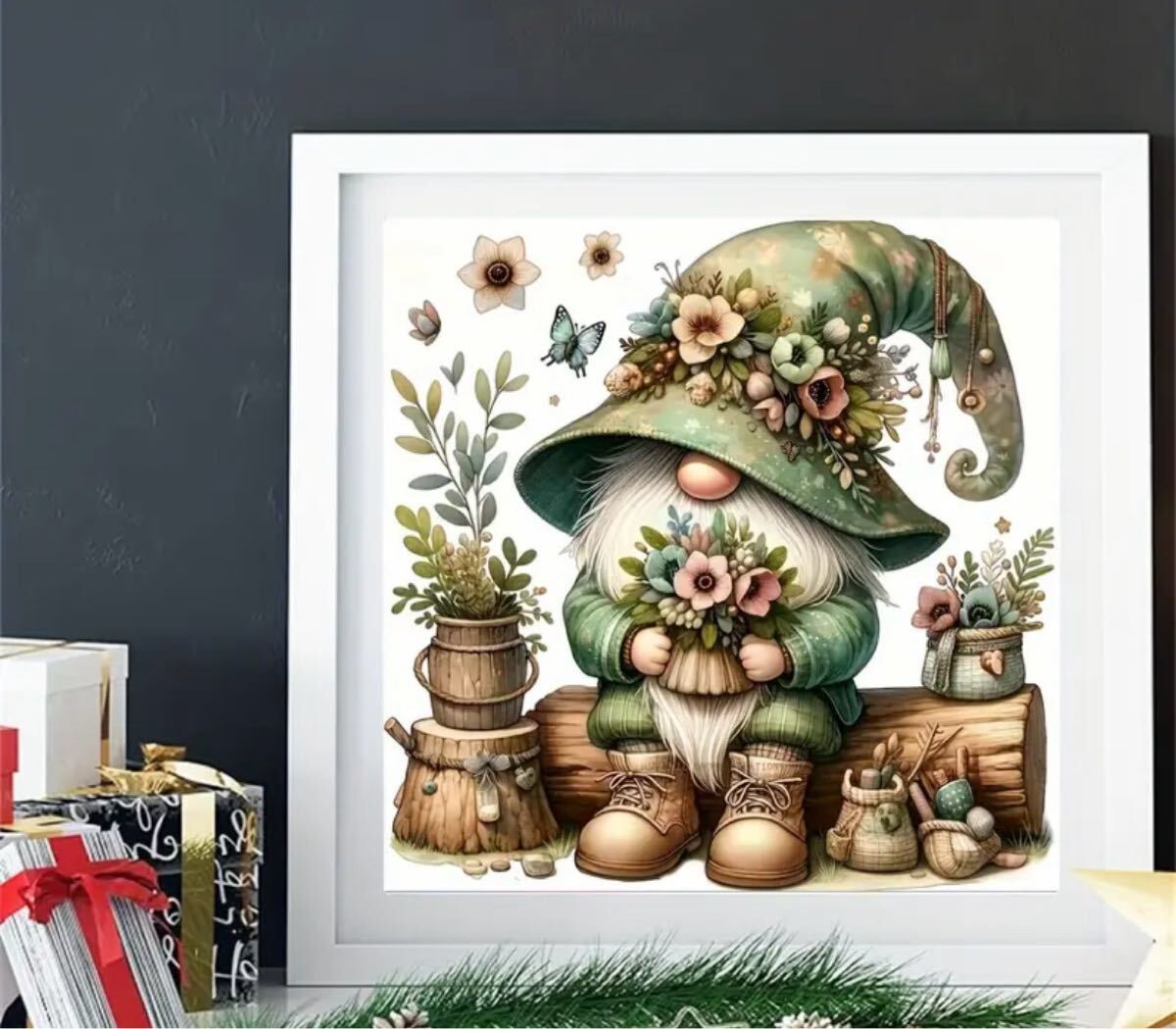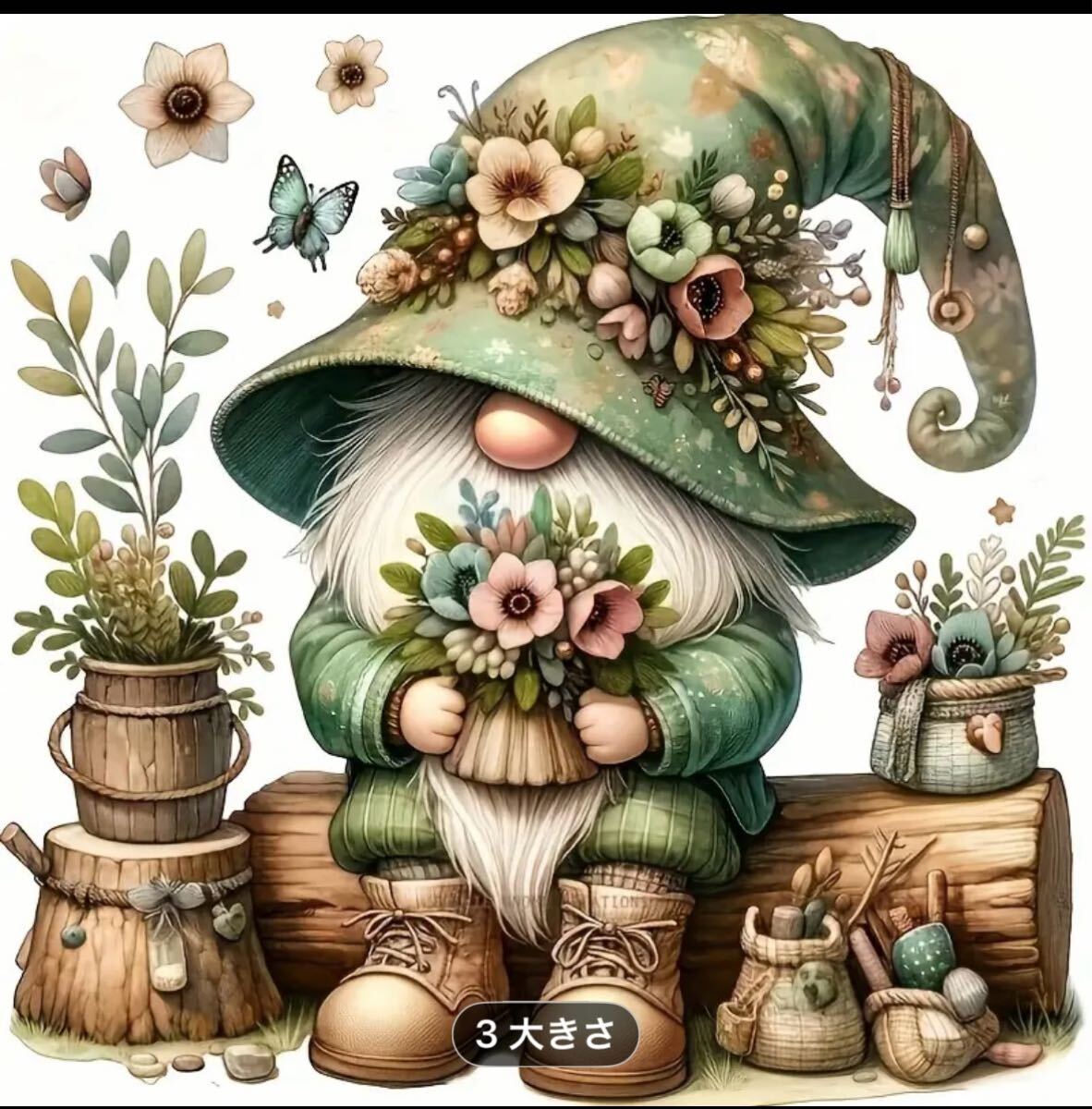 花と植物を持つ小人のダイヤモンドペインティング、サイズ20x20cm。