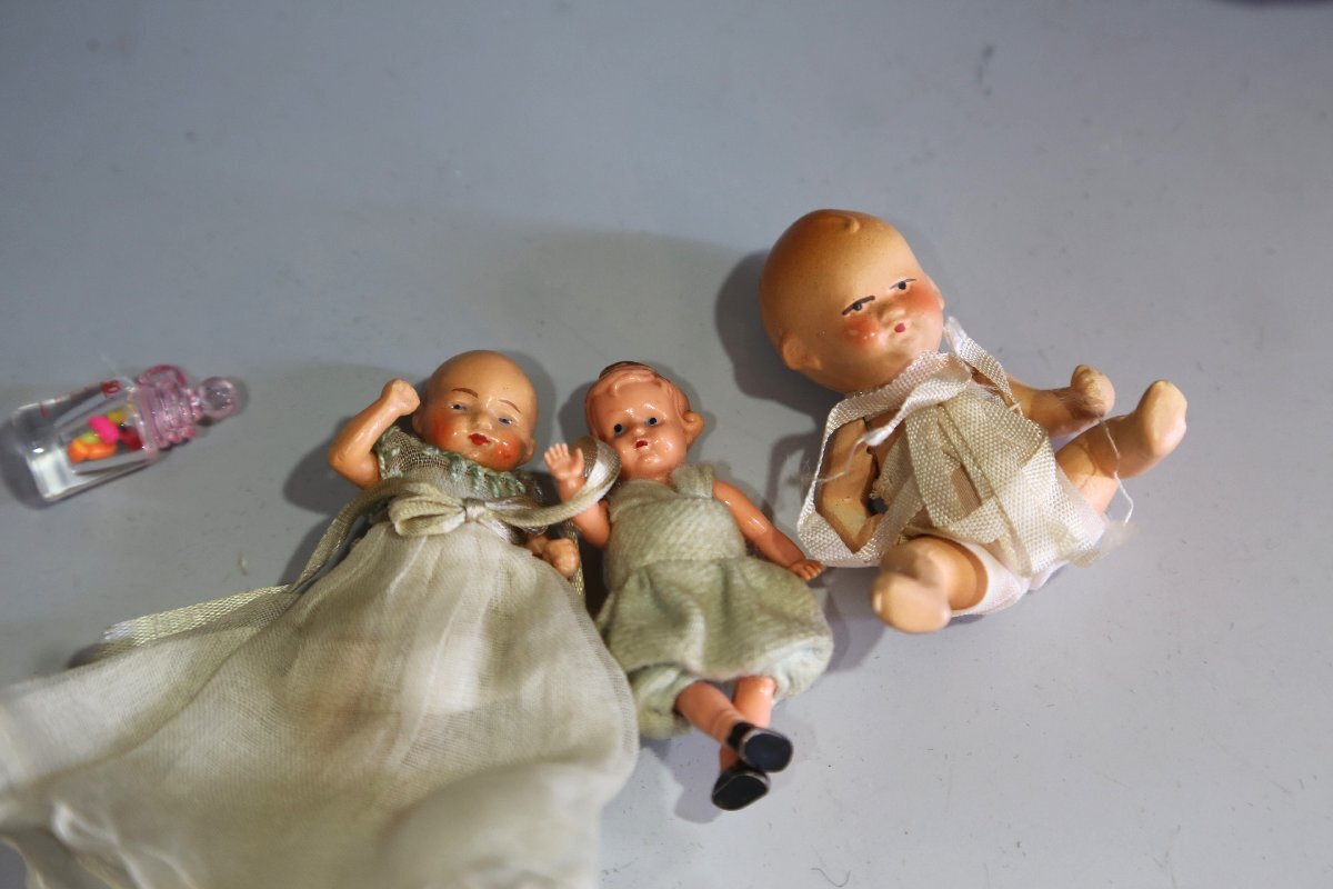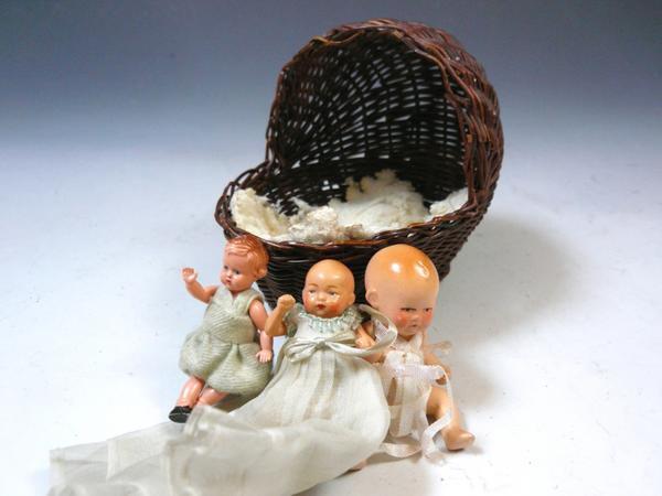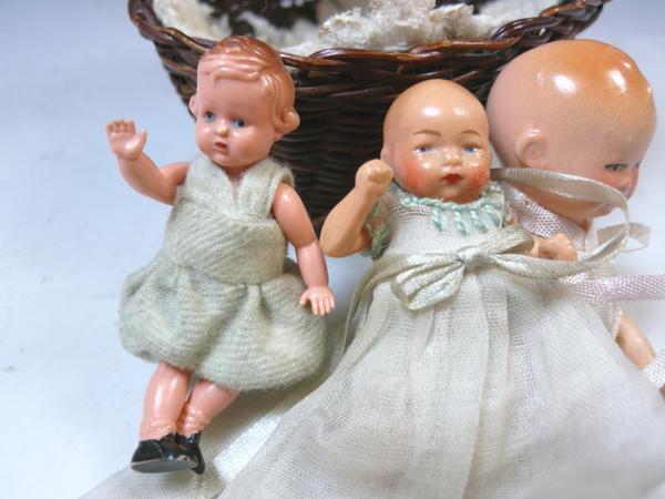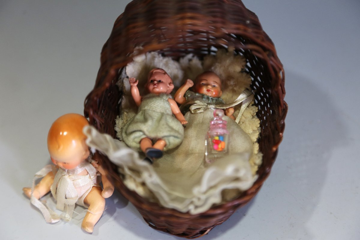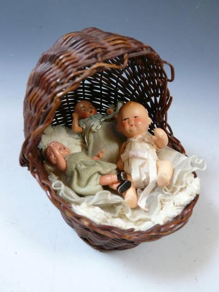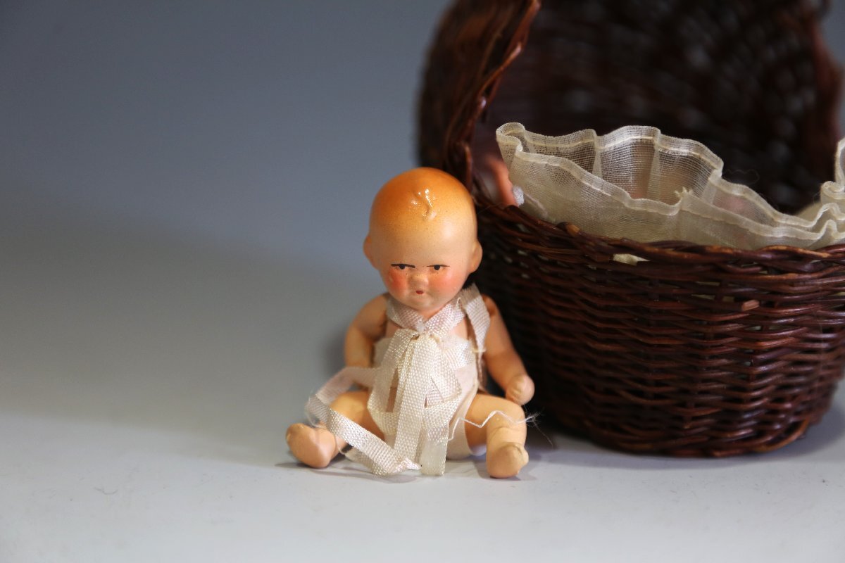 可愛い赤ちゃん人形。2つセルロイド。籠、縦横10・5cm。揺り篭に年のダメージあります。白のマットにも経年の枯れあります。ノークレーム、ノーリターンでお願い致します。この他にも出品しておりますので、ご覧下さい。ここをクリック