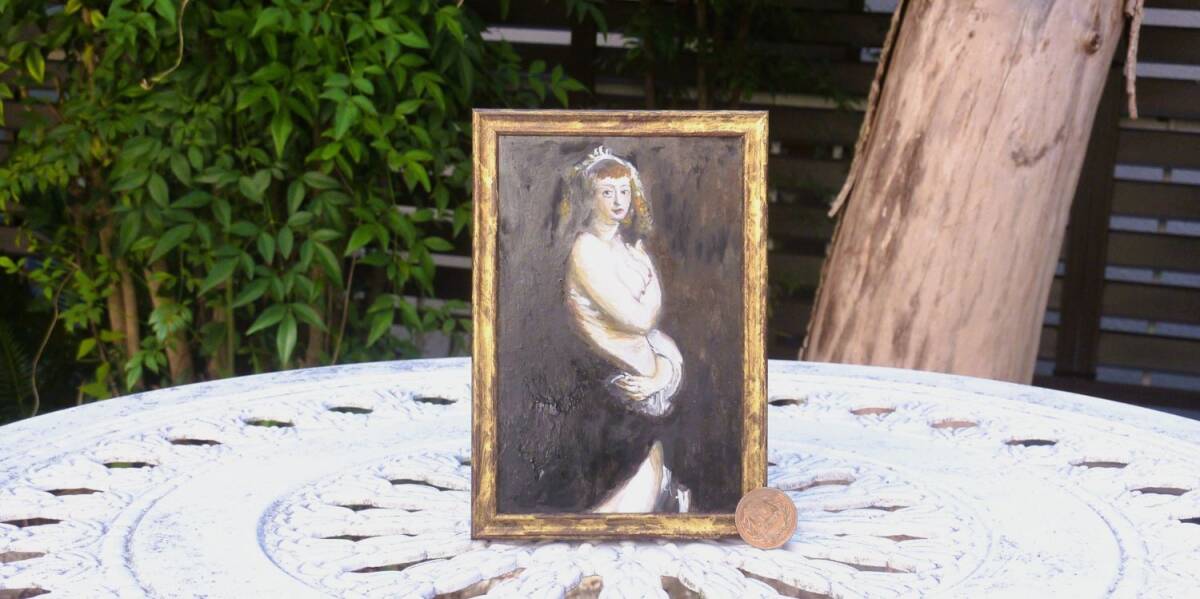 8年ほど前、友人にドールハウス用のリアルな古典絵画の額縁が販売されている。と、いう話を聞きました。まだ日本ではこの額縁で古典絵画のミニサイズの絵を描いている人がいないので描いてみては?と、いうお誘いがありました。さっそく紹介された店に行くと、本当に素晴らしい額縁でした。早速、厚紙に面相筆で練習をし始めました。偶然、随分前からフェイスブックにCGの作品をアップロードしていましたので、そこになんの説明もなくこのミニ絵画をアップロードしました。広く、海外のアートの好きな人が集まるグループです。すると意外と、様々な外国語で夥しい“いいね“と、共感するというメッセージをいただきました。
