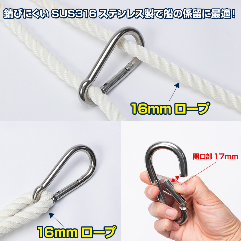 フェンダー取付金具や係留金具に最適な sus316 ステンレス スナップフック 120mm φ11mm です。■16mm ロープに最適な 120mm スプリングフック Lサイズ・シンブル使用時は12mm幅まで対応。■腐食に強いSUS316ステンレス 船/ボートの係留やエアフェンダー取付金具など海での使用に最適です。