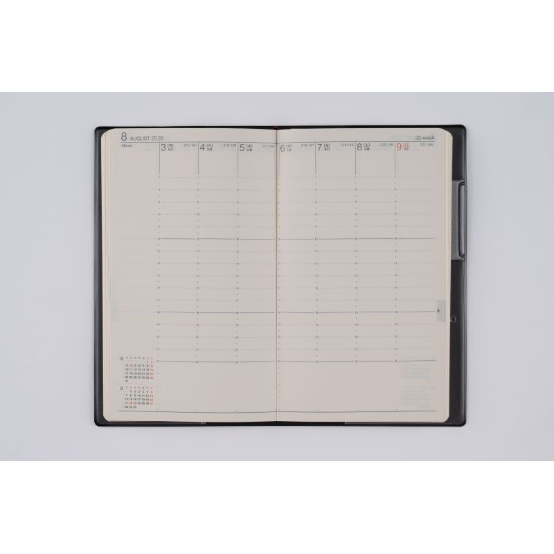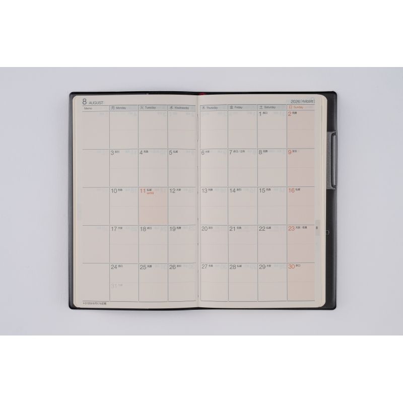 使いやすく、高級感のある皮革調。気軽に持ち運びできるサイズ感が人気の秘訣! 祝日と日曜が一目でわかる月間ページが収録されています。