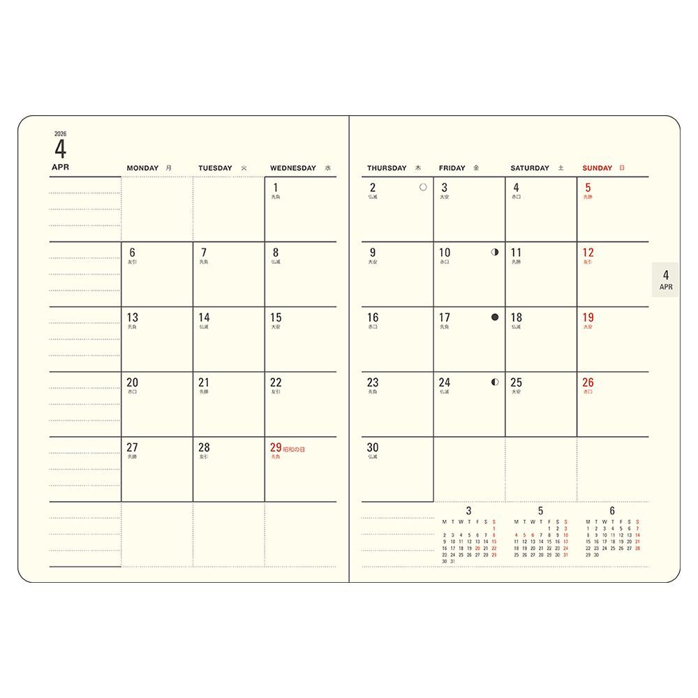 マンスリーには前月・翌月・翌々月の、ウィークリーには前月・当月・翌月・翌々月のミニカレンダーがついています。4ヶ月が見通せます。