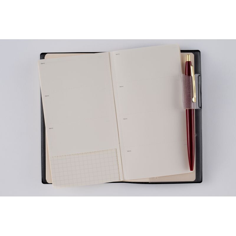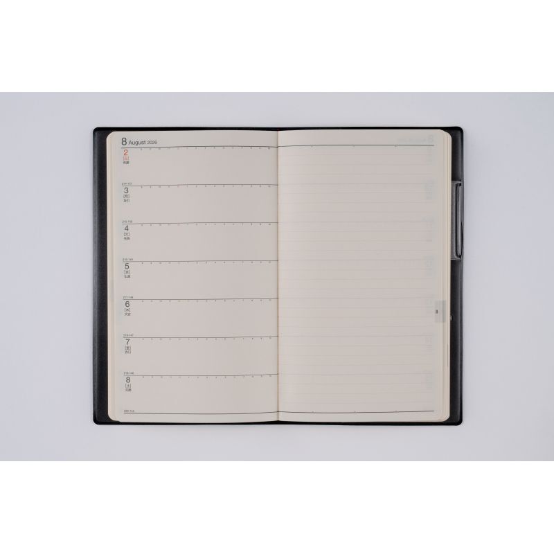 【週間予定表】左ページにスケジュール、右ページに罫線メモが付いているレフト式。仕事のメモや日記など、自由な使い方ができます。