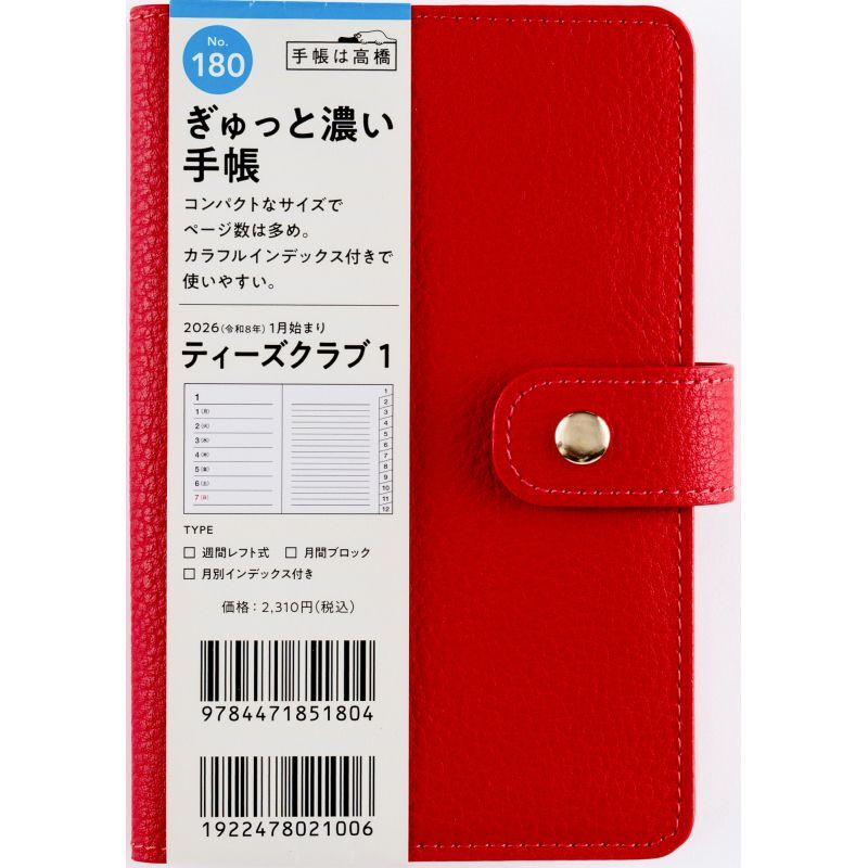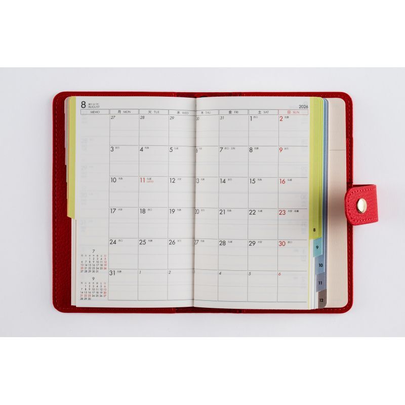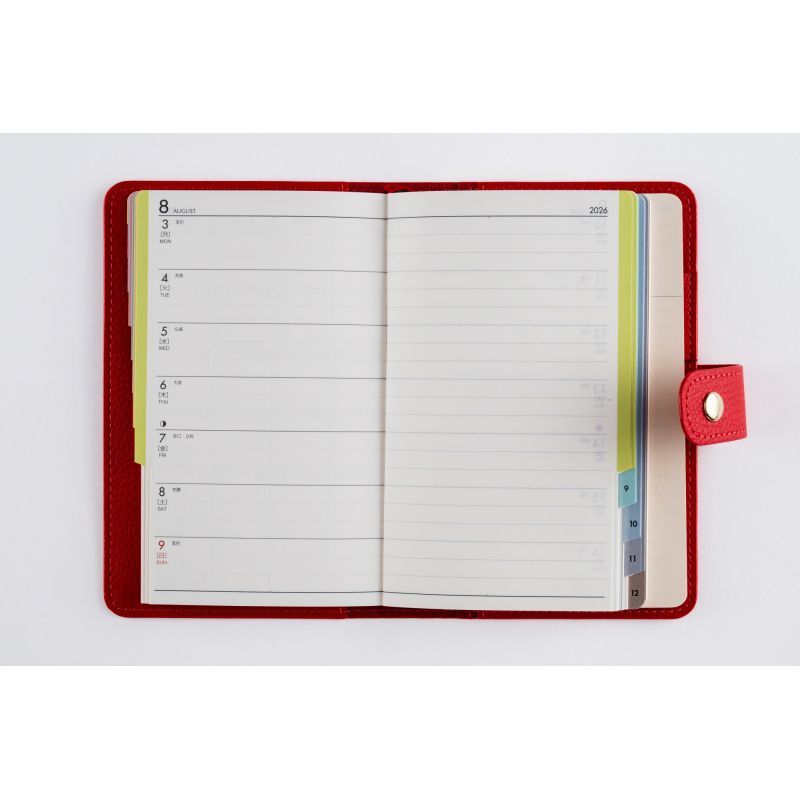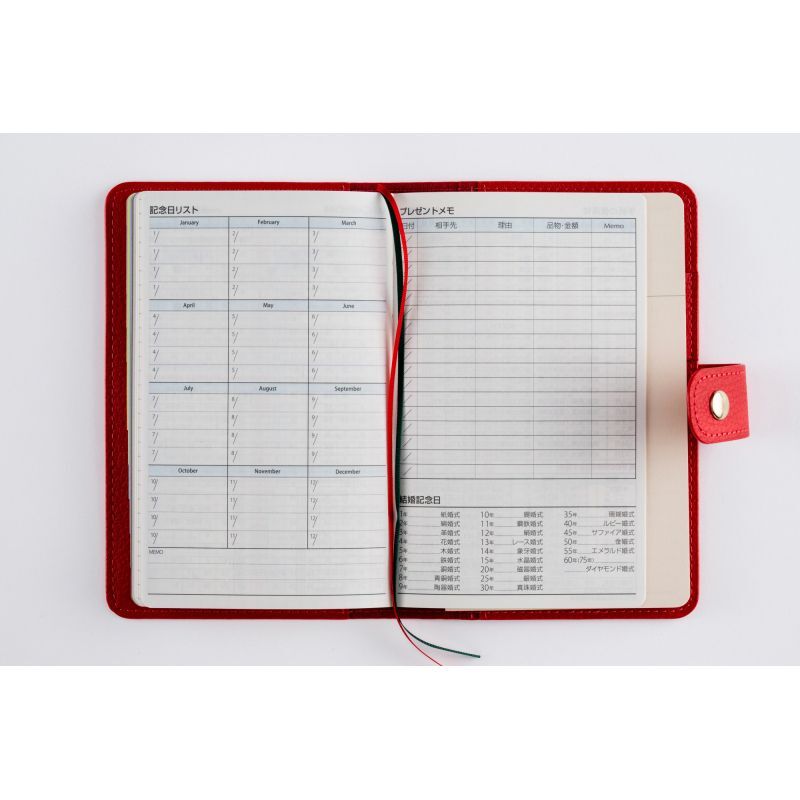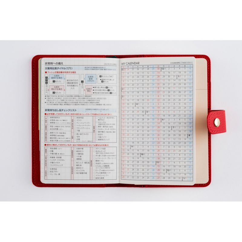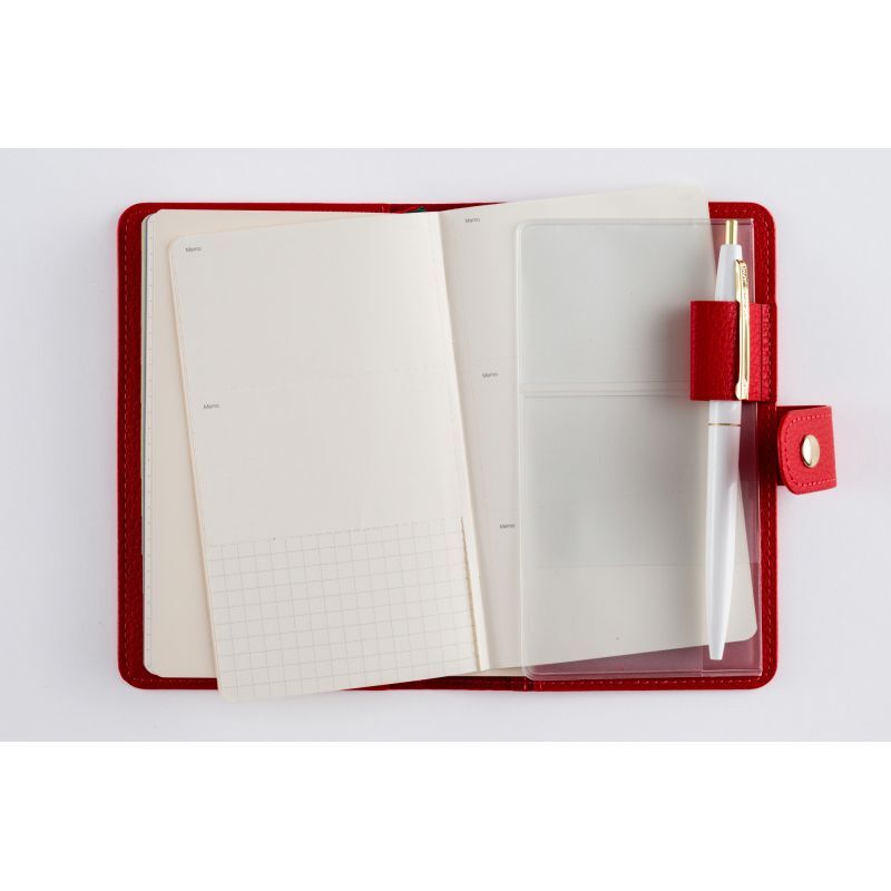 カバンの中で手帳が開いてしまう心配も、ベルト付きなら安心!カバーは皮革調の濃淡が大人っぽさを演出するレッド。ポケット数が多いのも特徴で、クリア素材のフリーポケットもついているため、手帳にたくさん挟みたい方におススメです。