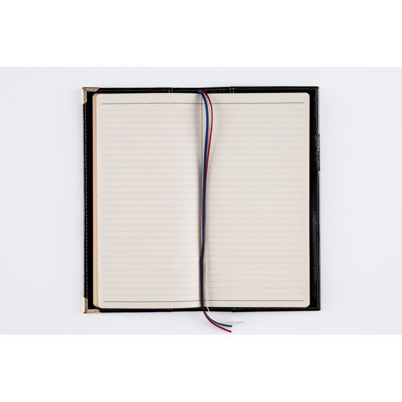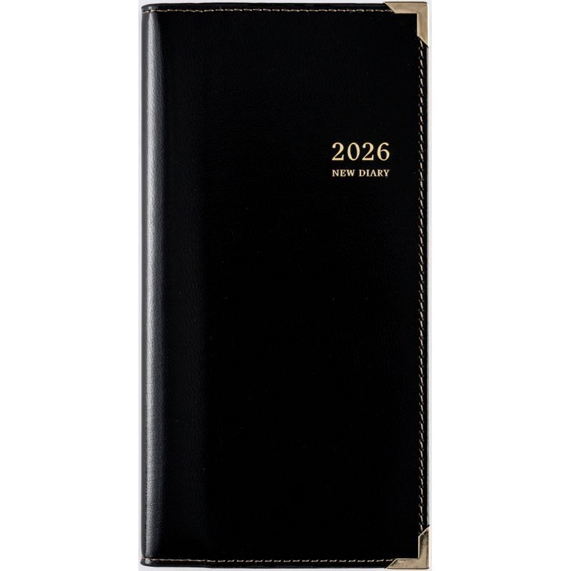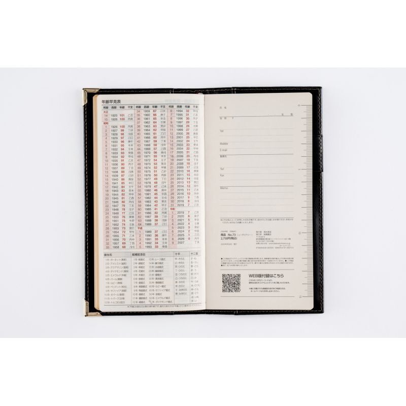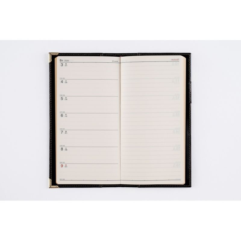 高級皮革調のシックなカバーは、角をしっかり保護する角金具付き。多くのビジネスパーソンに愛されたベーシックな記入形式が人気。月間ページは横ケイ式です。