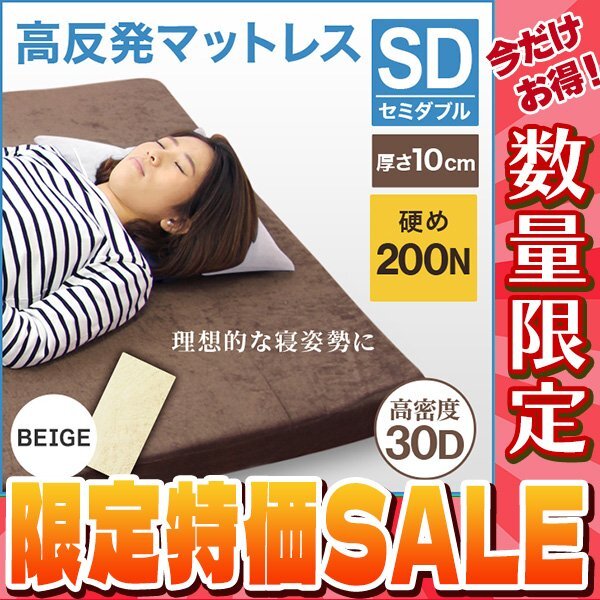 高密度30D!こだわりの硬さ200N! 厚みたっぷり10cm! 適度な硬さで身体をしっかり支える、高反発マットレスです。 柔らかいマットレスとは違い、身体の沈み込みを軽減した腰に優しい寝心地です。 高反発マットレスのウレタンフォームは弾性が高く、適度な硬さで身体を支えるので、底つき感もなくへたりにくいマットレスです。 寝返りが多い方や仰向けに寝ることが多い方におススメです。 取り外しやすいL字ファスナー付き洗えるカバーが付属しています! 【商品仕様】 カラー:ベージュ サイズ(約):幅120cm×長さ195cm×厚み10cm(セミダブルサイズ) 梱包サイズ(約):62×36.4×36.4cm 重量(約):8.5kg 素材:高反発ウレタン(密度30D(30kg/m3)) 、パイル生地 他 硬さ:200ニュートン 【注意事項】 耐熱仕様ではございませんので、電気毛布との併用はおやめください。 |