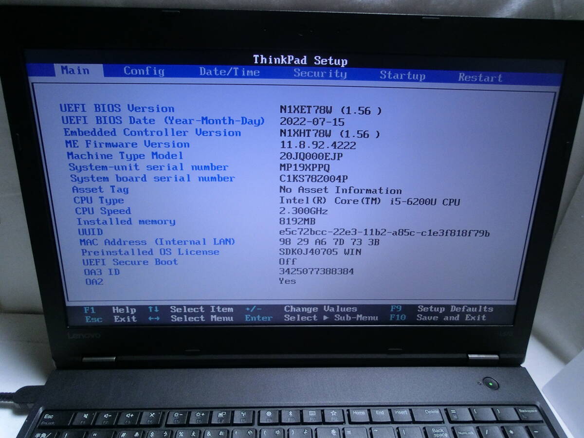 【ジャンク】Lenovo ThinkPad L570 20JQ000EJP(液晶不調)/Intel Core i5-6200U/メモリ8GB/ストレージ無/管:NPC2508-791