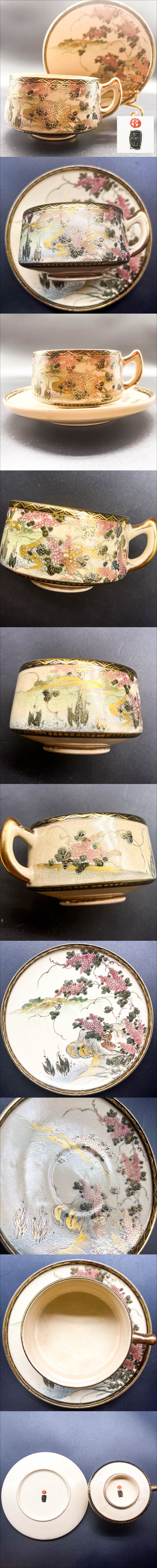 【薩摩】 乾山銘 金襴手 金彩花鳥文 藤 カップ&ソーサー 明治~大正期 アンティーク陶磁器 里帰り オールドニッポン [SN083102]