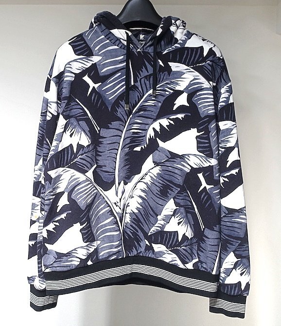 良品 DOLCE & GABBANA ドルガバ フェザープリント スウェット フーディ グレー×ブラック×ホワイト メンズ 52 羽根柄 パーカー