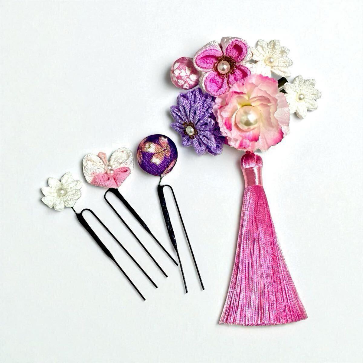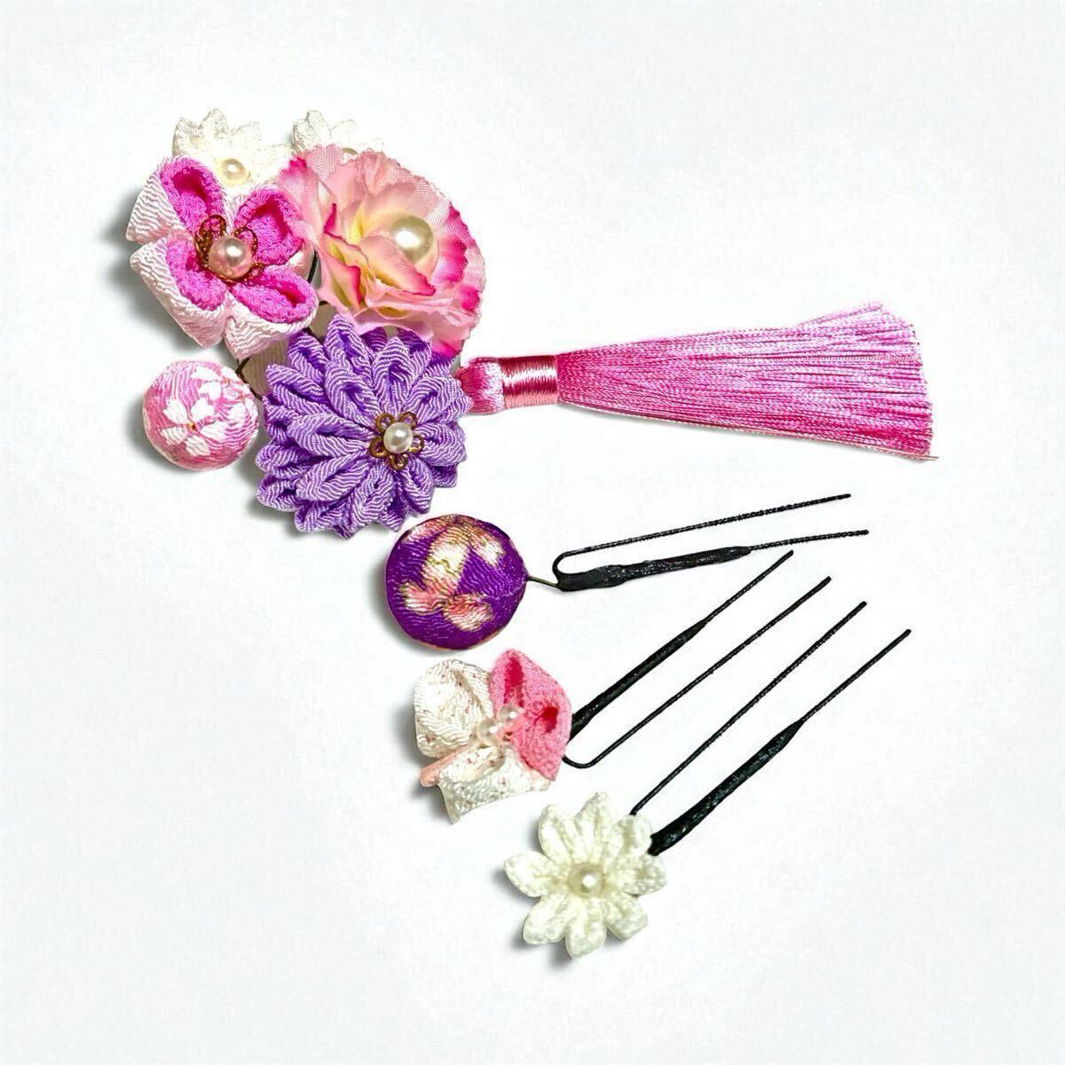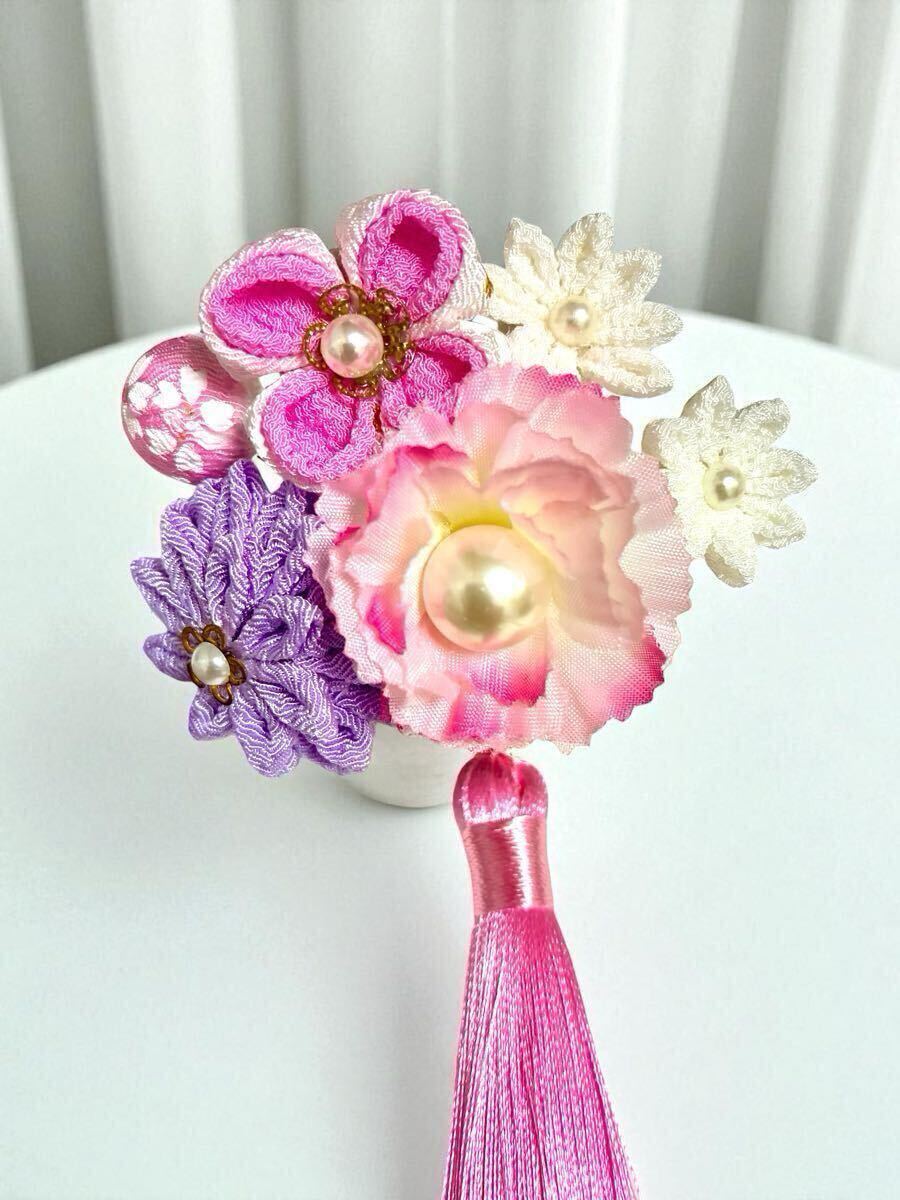 薄紫の半くすを主役に、ピンク・白の小花と、花先がほんのり色づくアーティフィシャルフラワーを組み合わせた、優美なつまみ細工の髪飾りです。ちりめん(レーヨン)を中心に、淡い桜柄のちりめん玉と優雅な蝶モチーフで、上品な印象に仕上げました。