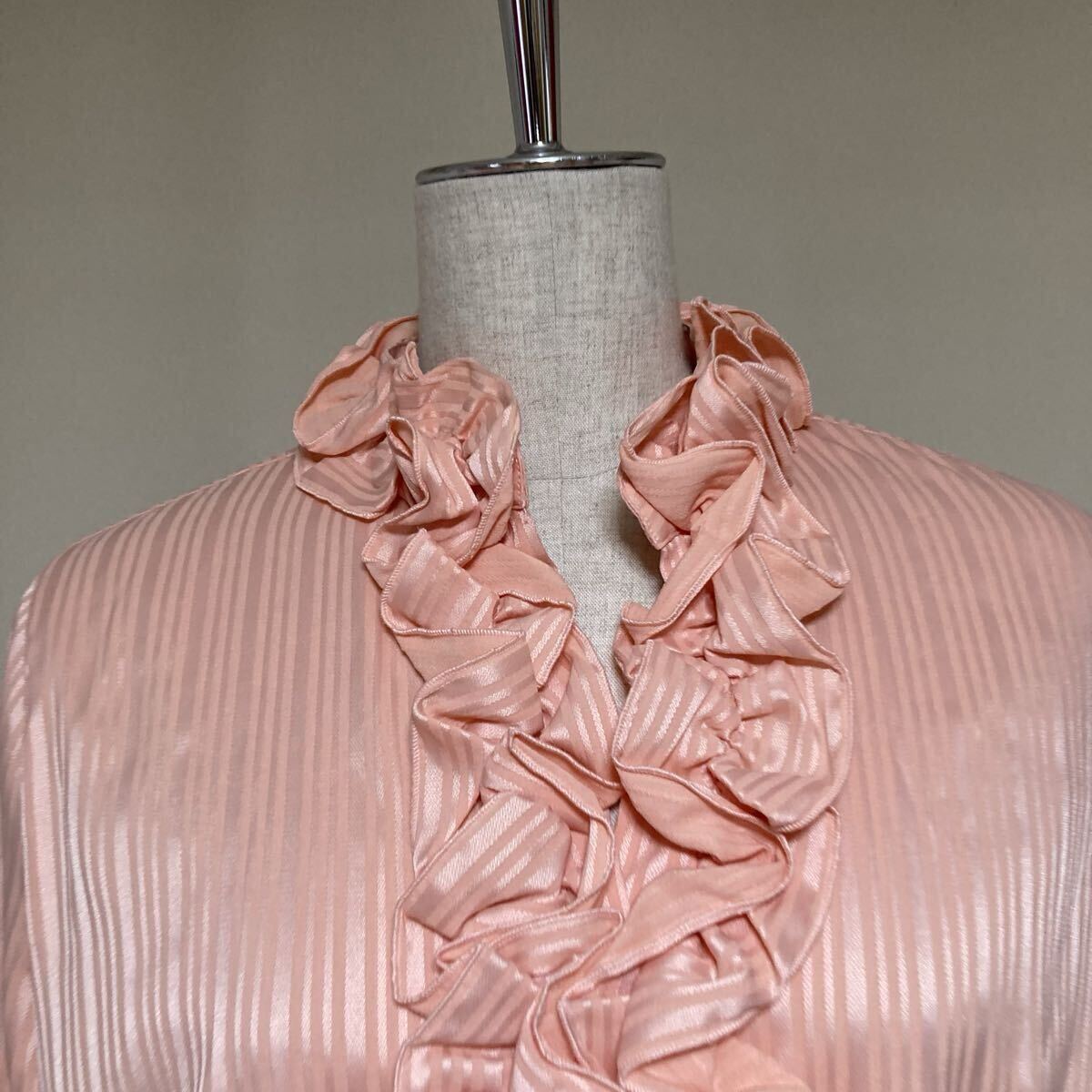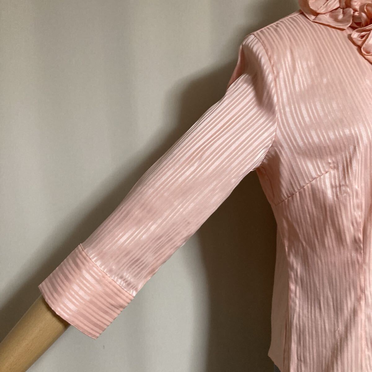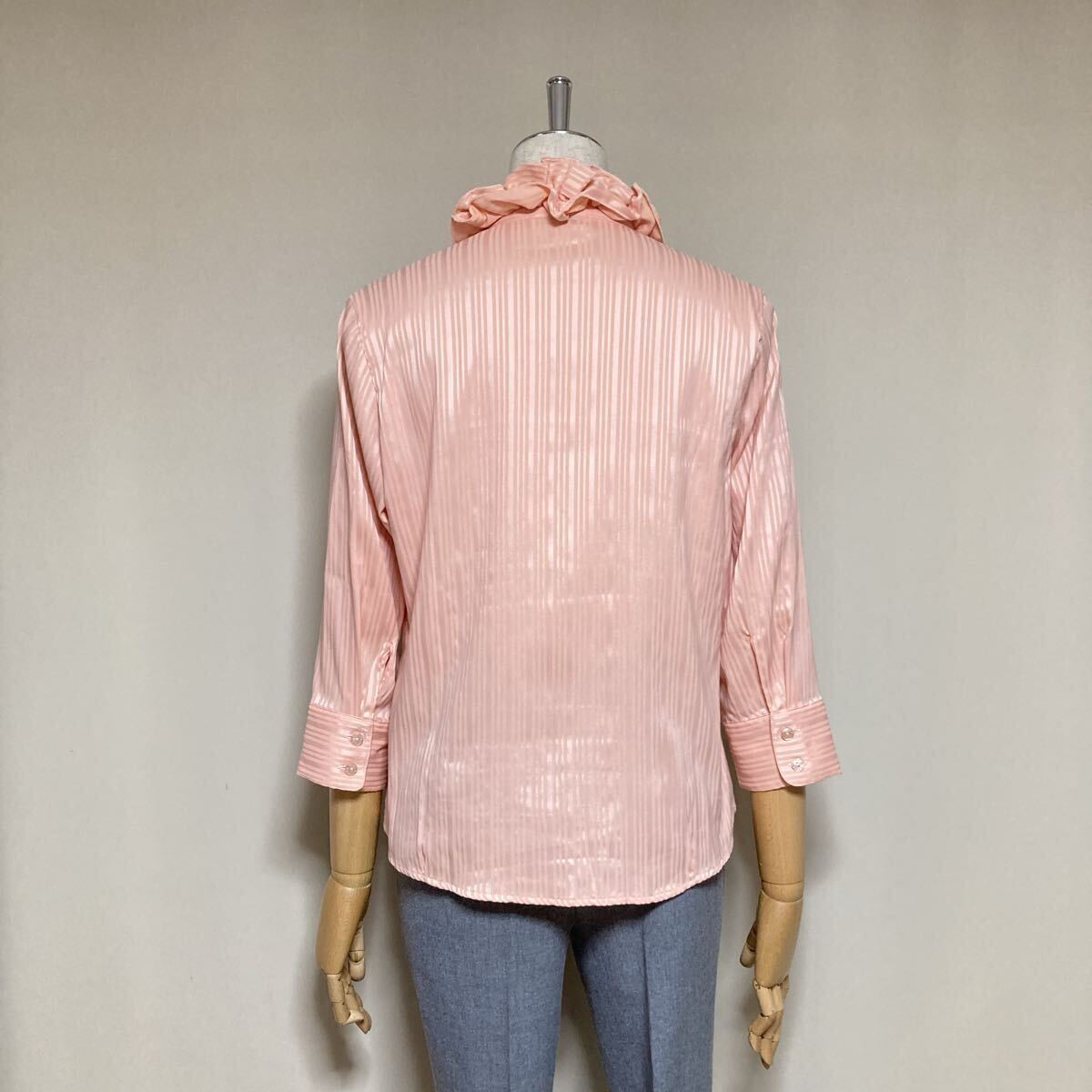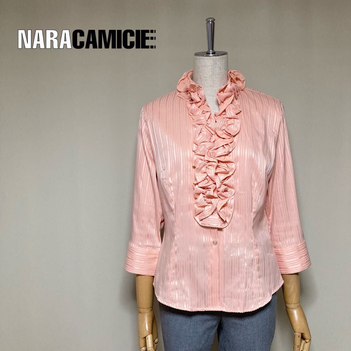 【NARACAMICIE】ナラカミーチェ 洗える ストレッチ ストライプ フロントフリル 七分袖ブラウス シャツ サイズ2/L相当 ピンク レディース