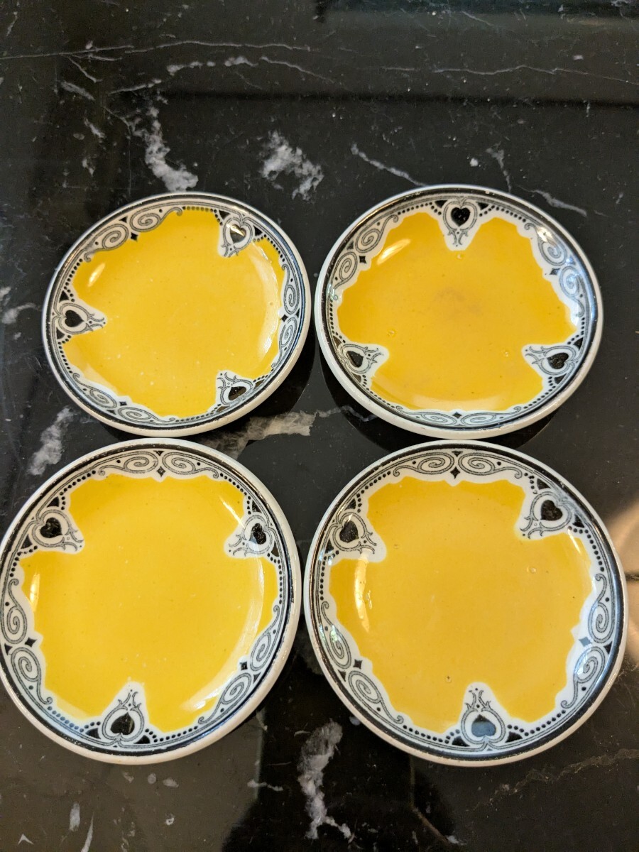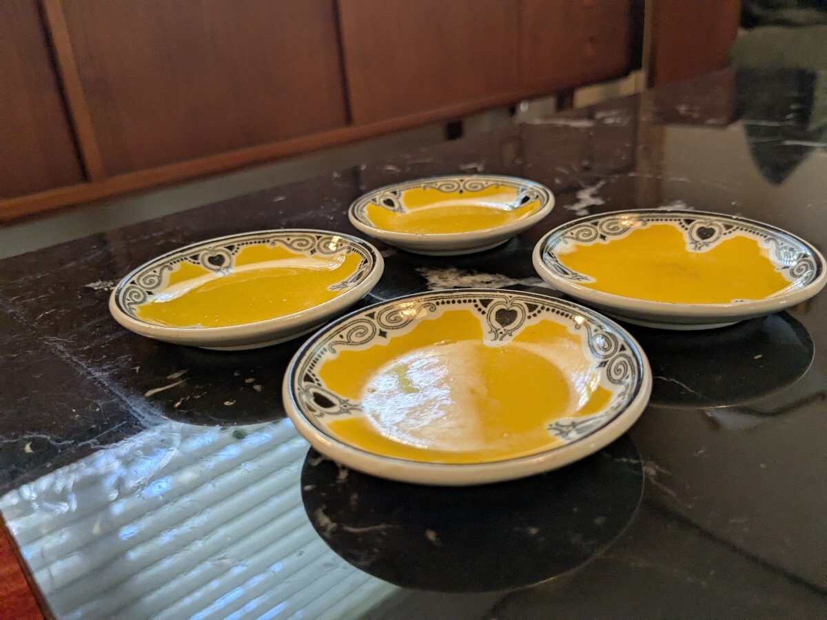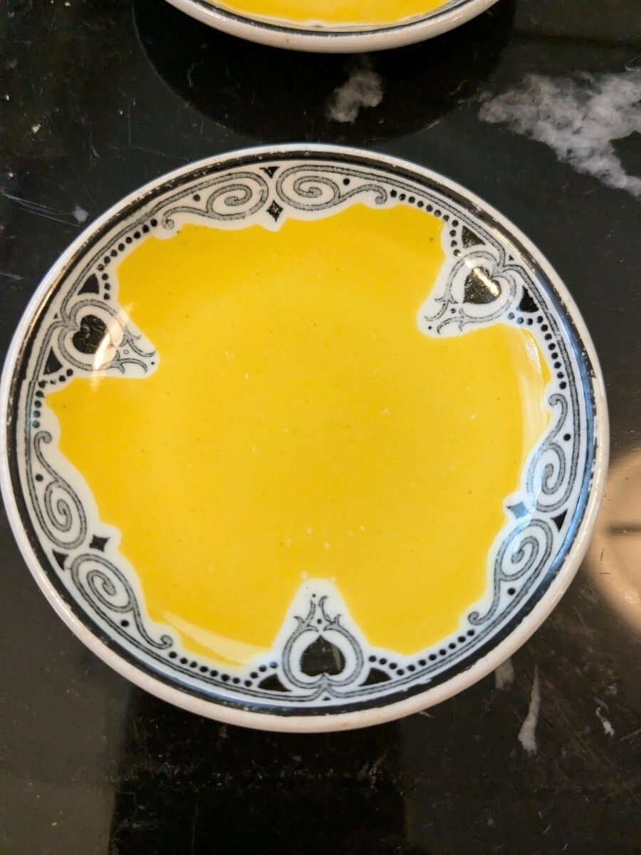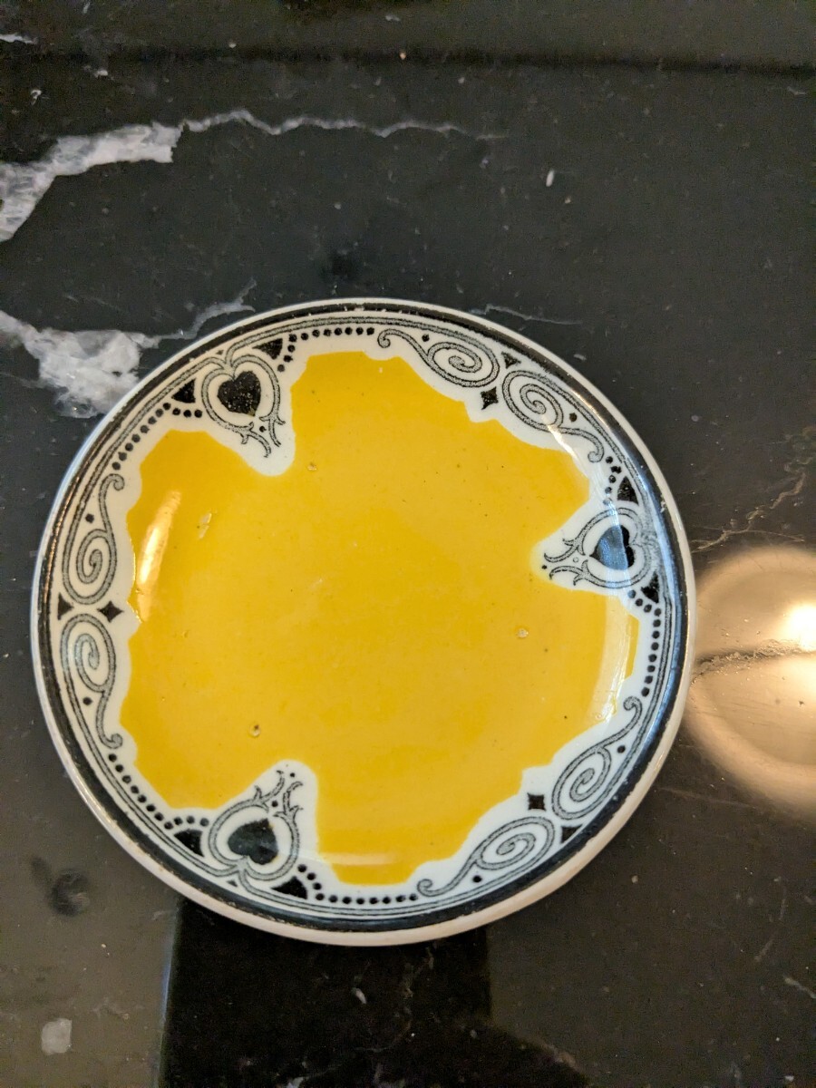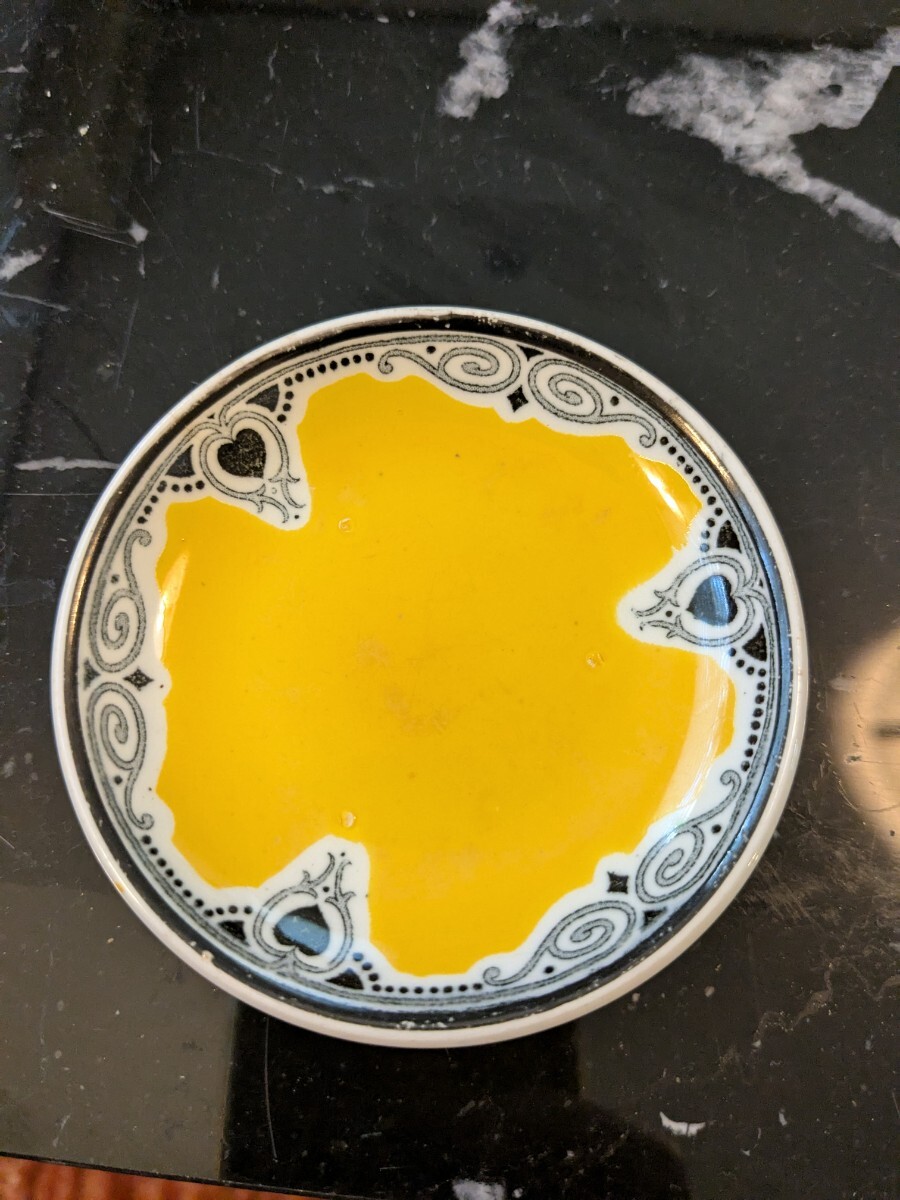 1863年に設立されたオランダ マーストリヒトの陶磁器メーカーSOCIETE SERAMIQUEのトスカーナというシリーズと思われます。直径75センチの豆皿です。アムステルダムのアンティークショップで購入。傷、カケはありません、古いものですので、ヨゴレのようなものが見受けられるものもありますが、アンティークの味わいとして、楽しめるものです。写真をご覧ください。中央の黄色が独特な色味で素敵です